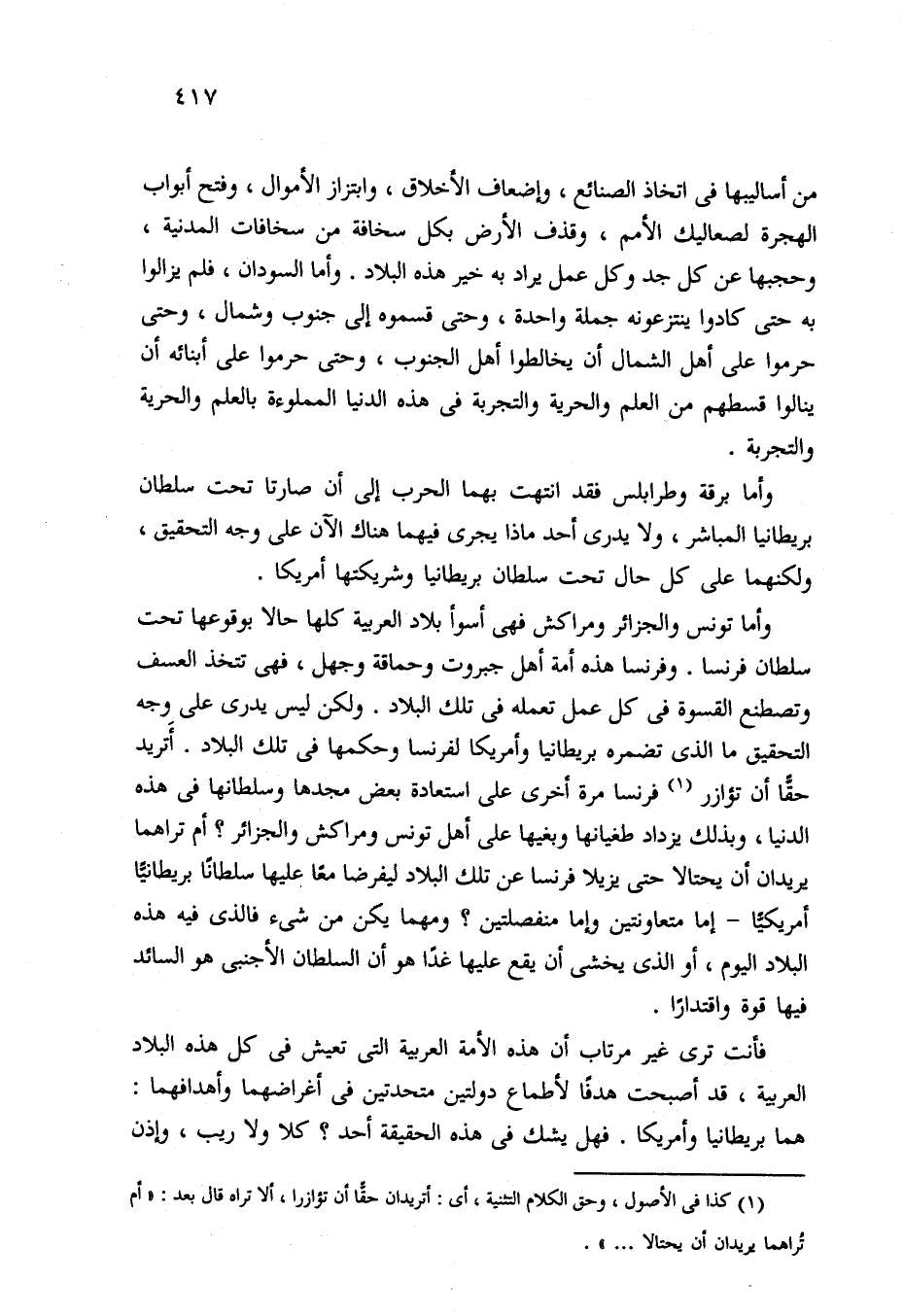 وأما تونس والجزائر ومراكش فهي أسوأ بلاد العربية كلها حالا بوقوعها تحت سلطان فرنسا. وفرنسا هذه أمة أهل جبروت وحماقة وجهل، فهي تتخذ العسف وتصطنع القسوة في كل عمل تعمله في تلك البلاد. ولكن ليس يدرى على وجه التحقيق ما الذي تضمره بريطانيا وأمريكا لفرنسا وحكمها في تلك البلاد. أَتريد حقًّا أن تؤازر (¬1) فرنسا مرة أخرى على استعادة بعض مجدها وسلطانها في هذه الدنيا، وبذلك يزداد طغيانها وبغيها على أهل تونس ومراكش والجزائر؟ أم تراهما يريدان أن يحتالا حتى يزيلا فرنسا عن تلك البلاد ليفرضا معًا عليها سلطانًا بريطانيًّا أمريكيًّا - إما متعاونتين وإما منفصلتين؟ ومهما يكن من شيء فالذي فيه هذه البلاد اليوم، أو الذي يخشى أن يقع عليها غدًا هو أن السلطان الأجنبى هو السائد فيها قوة واقتدارًا.