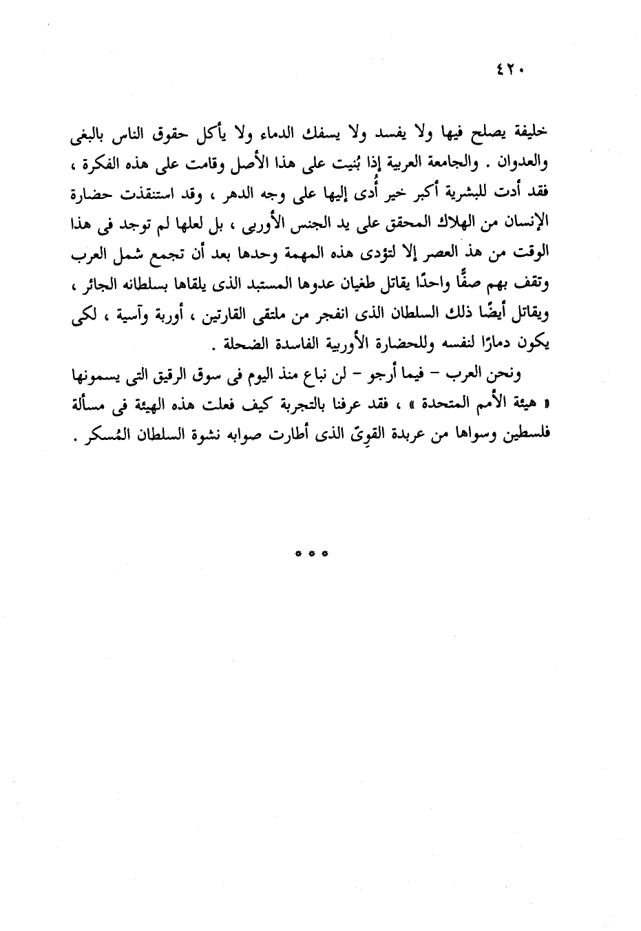 ونحن العرب -فيما أرجو- لن نباع منذ اليوم في سوق الرقيق التي يسمونها "هيئة الأمم المتحدة"، فقد عرفنا بالتجربة كيف فعلت هذه الهيئة في مسألة فلسطين وسواها من عربدة القوِي الذي أطارت صوابه نشوة السلطان المُسكر.