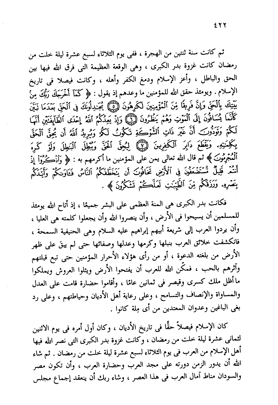 كان الإسلام فيصلًا حقًا في تاريخ الأديان، وكان أول أمره في يوم الاثنين لثماني عشرة ليلة خلت من رمضان، وكانت غزوة بدر الكبرى التي نصر الله فيها أهل الإسلام من العرب في يوم الثلاثاء لسبع عشرة ليلة خلت من رمضان. ثم شاء الله أن يدور الزمن دورته على مجد العرب وحضارة العرب، وأن تكون مصر والسودان مناط آمال العرب في هذا العصر، وشاء ربك أن ينعقد إجماع مجلس