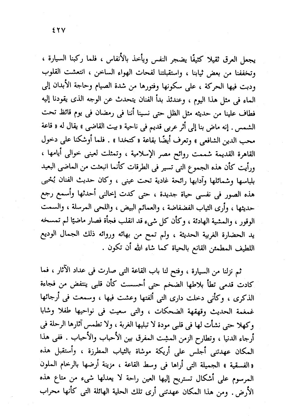 يجعل العرق ثقيلا كثيفًا يضجر النفس ويأخذ بالأنفاس، فلما ركبنا السيارة، وتخففنا من بعض ثيابنا، واستقبلتنا لفحات الهواء الساخن، انتعشت القلوب ودبت فيها الحركة، على سكونها وفتورها من شدة الصيام وحاجة الأبدان إلى الماء في مثل هذا اليوم، وعندئذ بدأ الفنان يتحدث عن الوجه الذي يقودنا إليه فطاف علينا من حديثه مثل الظل حتى نسينا أننا في رمضان في يوم قائظ تحت الشمس. إنه ماض بنا إلى أثر عربي قديم في ناحية "بيت القاضي" يقال له "قاعة محب الدين الشافعي" وتعرف أيضًا بقاعة "كتخدا". فلما أوشكنا على دخول القاهرة القديمة شممت روائح مصر الإسلامية، وتمثلت لعيني خوالى أيامها، ورأيت كأن هذه الجموع التي تسير في الطرقات كأنما انبعثت من الماضي البعيد بلباسها وشمائلها وآدابها رائحة غادية تحت عيني، وكان حديث الفنان يُحْيى هذه الصور في نفسي حياة جديدة، حتى كدت إخالنى أحدثها وأسمع رجع حديثها، وأرى الثياب الفضفاضة، والعمائم البيض، واللحى المرسلة، والسمت الوقور، والمشية الهادئة، وكأن كل شيء قد انقلب فجأة فصار ماضيًا لم تمسخه يد الحضارة الغربية الحديثة، ولم تمح من بهائه وروائه ذلك الجمال الوديع اللطيف المطمئن القانع بالحياة كما شاء الله أن تكون.