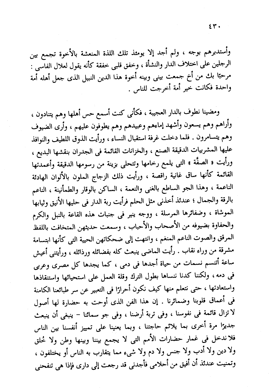 ومضينا نطوف بالدار العجيبة، فكأني كنت أسمع حس أهلها وهم يتنادون، وأراهم وهم يسعون وأشهد إماءهم وعبيدهم وهم يطوفون عليهم، وأرى الضيوف وهم يتسامرون. فلما دخلت غرفة استقبال النساء، ورأيت الذوق اللطيف والنوافذ عليها المشربيات الدقيقة الصنع، والخزانات القائمة في الجدران بنقشها البديع، ورأيت "الصفَّة" التي يلمع رخامها وتتحلى بزينة من رسومها الدقيقة وأعمدتها القائمة كأنها ساق غانية راقصة، ورأيت ذلك الزجاج الملون بالألوان الهادئة الناعمة، وهذا الجو الساطع بالغنى والنعمة، الساكن بالوقار والطمأنينة، الناعم بالرقة والجمال؛ عندئذ أخذنى مثل الحلم فرأيت ربة الدار في حليها الأنيق وثيابها الموشاة، وضفائرها المرسلة، ووجه ينير في جنبات هذه القاعة بالنبل والكرم والحفاوة بضيوفه من الأصحاب والأحباب، وسمعت حديثهن المتخافت باللفظ المرقق والصوت الناعم المنغم، وانتهت إلى ضحكاتهن الحيية التي كأنها ابتسامة مشرقة من وراء نقاب. رأيت الماضي ينبعث كله بفضائله ورذائله، ورأيتنى أعيش ساعة أتنسم نسمات من حياة أجدها في دمى، كما يجدها كل مصري وعربي في دمه، ولكننا كدنا ننساها بطول الترك وقلة العمل على استحيائها واستنقاذها واستعادتها، حتى نتعلم منها كيف نكون أحرارًا في التعبير عن سر طبائعنا الكامنة في أعماق قلوبنا وضمائرنا. إن هذا الفن الذي أوحت به حضارة لها أصول لا تزال قائمة في نفوسنا، وفي تربة أرضنا، وفي جو سمائنا -ينبغي أن ينبعث جديرًا مرة أخرى بما يلائم حاجتنا، وبما يعنينا على تمييز أنفسنا بين الناس فلا ندخل في غمار حضارات الأمم التي لا يجمع بيننا وبينها وطن ولا خُلق ولا دين ولا أدب ولا جنس ولا دم ولا شيء مما يتقارب به الناس أو يختلفون، وتمنيت عندئذ أن أفيق من أحلامى فأجدنى قد رجعت إلى داري فإذا هي تنفحني