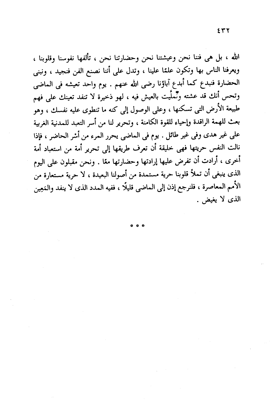 الله، بل هي فننا نحن وعيشتنا نحن وحضارتنا نحن، تألفها نفوسنا وقلوبنا، ويعرفنا الناس بها وتكون علمًا علينا، وتدل على أننا نصنع الفن فنجيد، ونبنى الحضارة فنبدع كما أبدع آباؤنا رضي الله عنهم. يوم واحد تعيشه في الماضي وتحس أنك قد عشته وتملَّيت بالعيش فيه، لهو ذخيرة لا تنفد تعينك على فهم طبيعة الأرض التي تسكنها، وعلى الوصول إلى كنه ما تنطوى عليه نفسك، وهو بعث للهمة الراقدة وإحياء للقوة الكامنة، وتحرير لنا من أسر التعبد للمدنية الغربية على غير هدى وفي غير طائل. يوم في الماضي يحرر المرء من أسْر الحاضر، فإذا نالت النفس حريتها فهي خليقة أن تعرف طريقها إلى تحرير أمة من استعباد أمة أخرى، أرادت أن تفرض عليها إرادتها وحضارتها معًا. ونحن مقبلون على اليوم الذي ينبغي أن تملأ قلوبنا حرية مستمدة من أصولنا البعيدة، لا حرية مستعارة من الأمم المعاصرة، فلنرجع إذن إلى الماضي قليلًا، ففيه المدد الذي لا ينفد والمَعِين الذي لا يغيض.