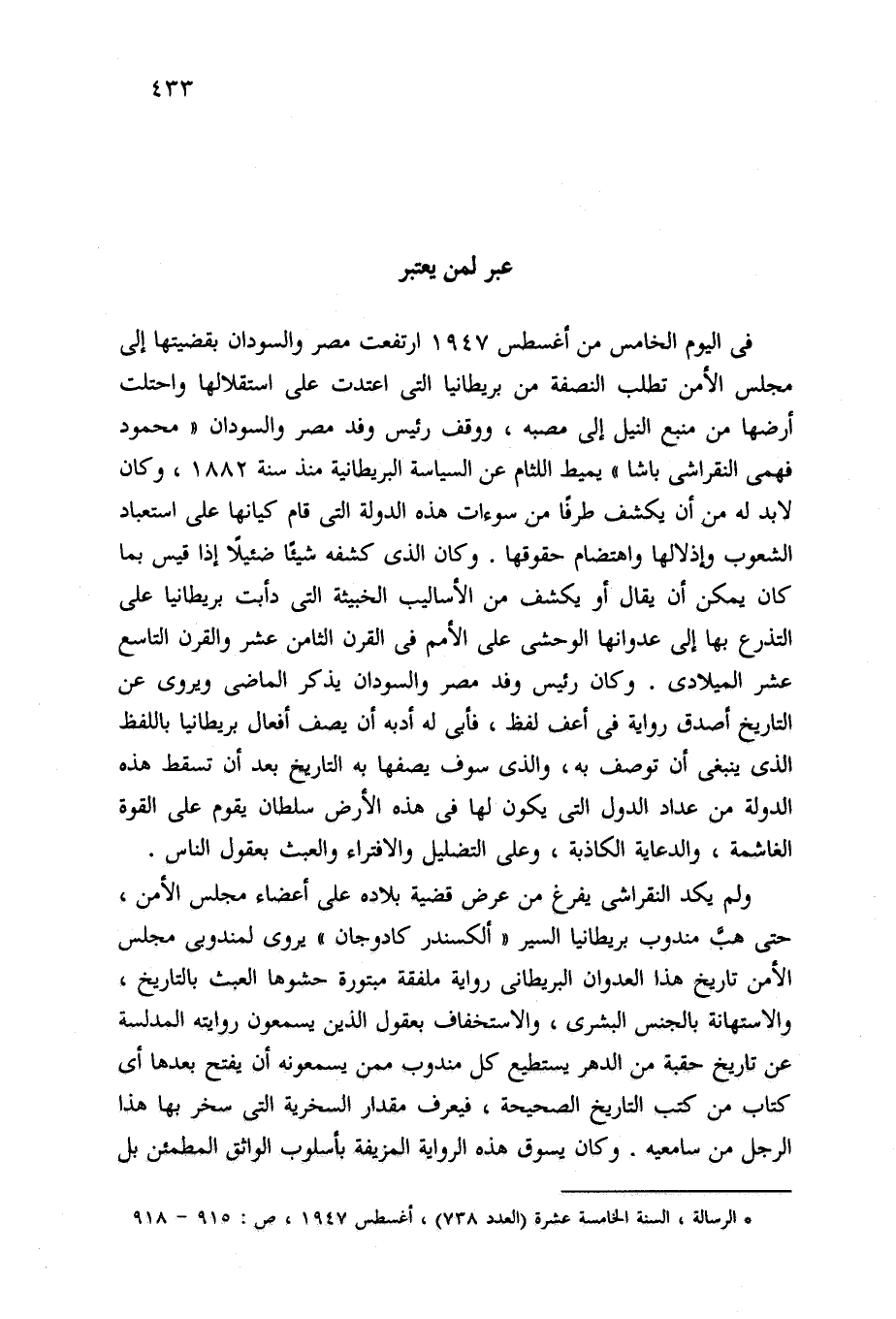 (*) الرسالة، السنة الخامسة عشرة (العدد 738)، أغسطس 1947، ص: 915 - 918
