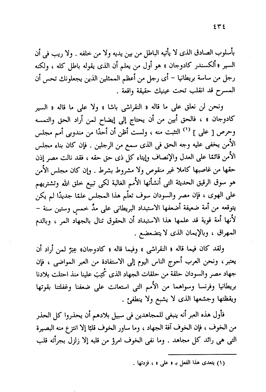 ولقد كان فيما قاله "النقراشى" وفيما قاله "كادوجان" عِبَرٌ لمن أراد أن يعتبر، ونحن العرب أحوج الناس اليوم إلى الاستفادة من العبر المواضى، فإن جهاد مصر والسودان حلقة من حلقات الجهاد الذي كُتِبَ علينا منذ احتلت بلادنا بريطانيا وفرنسا وسواهما من الأمم التي استعانت على ضعفنا وغفلتنا بقوتها ويقظتها وجشعها الذي لا يشبع ولا ينطفئ.