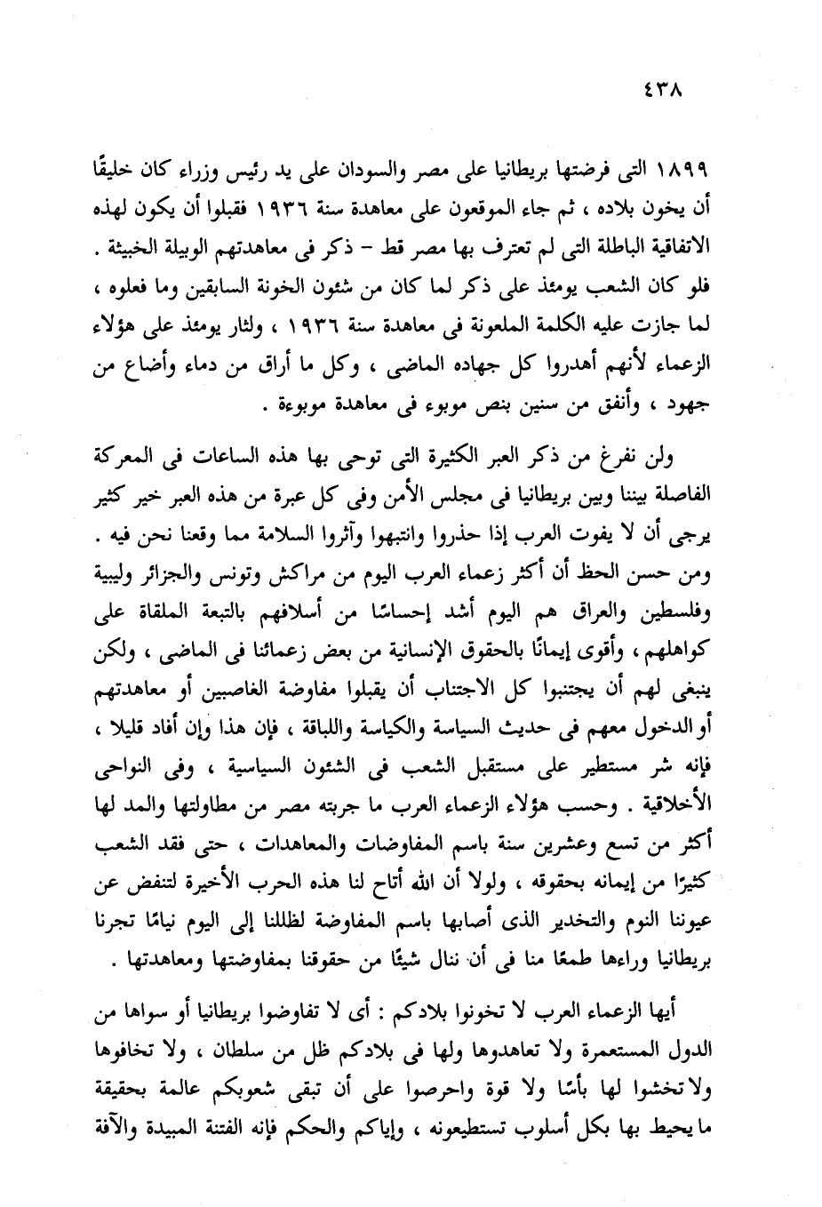 1899 التي فرضتها بريطانيا على مصر والسودان على يد رئيس وزراء كان خليقًا أن يخون بلاده، ثم جاء الموقعون على معاهدة سنة 1936 فقبلوا أن يكون لهذه الاتفاقية الباطلة التي لم تعترف بها مصر قط -ذكر في معاهدتهم الوبيلة الخبيثة. فلو كان الشعب يومئذ على ذكر لما كان من شئون الخونة السابقين وما فعلوه، لما جازت عليه الكلمة الملعونة في معاهدة سنة 1936، ولثار يومئذ على هؤلاء الزعماء لأنهم أهدروا كل جهاده الماضي، وكل ما أراق من دماء وأضاع من جهود، وأنفق من سنين بنص موبوء في معاهدة موبوءة.