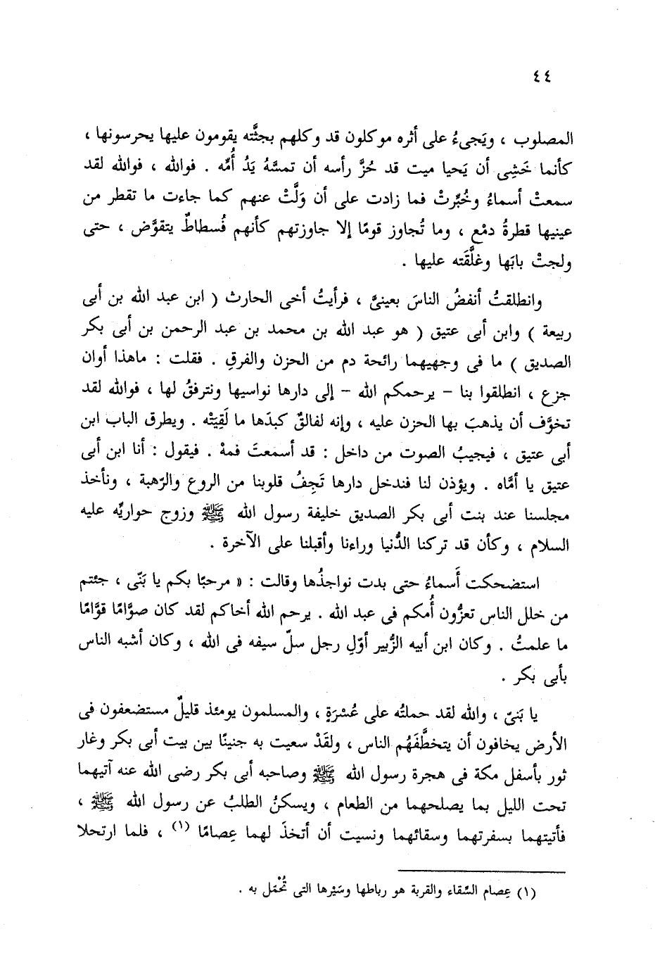 يا بَني، والله لقد حملتُه على عُسرَة، والمسلمون يومئذ قليل مستضعفون في الأرض يخافون أن يتخطَّفَهُم الناس، ولقَدْ سعيت به جنينا بين بيت أبي بكر وغار ثور بأسفل مكة في هجرة رسول الله - صلى الله عليه وسلم - وصاحبه أبي بكر - رضي الله عنه - آتيهما تحت الليل بما يصلحهما من الطعام، ويسكن الطلب عن رسول الله - صلى الله عليه وسلم -، فأتيتهما بسفرتهما وسقائهما ونسيت أن أتخذَ لهما عِصامًا (¬1)، فلما ارتحلا