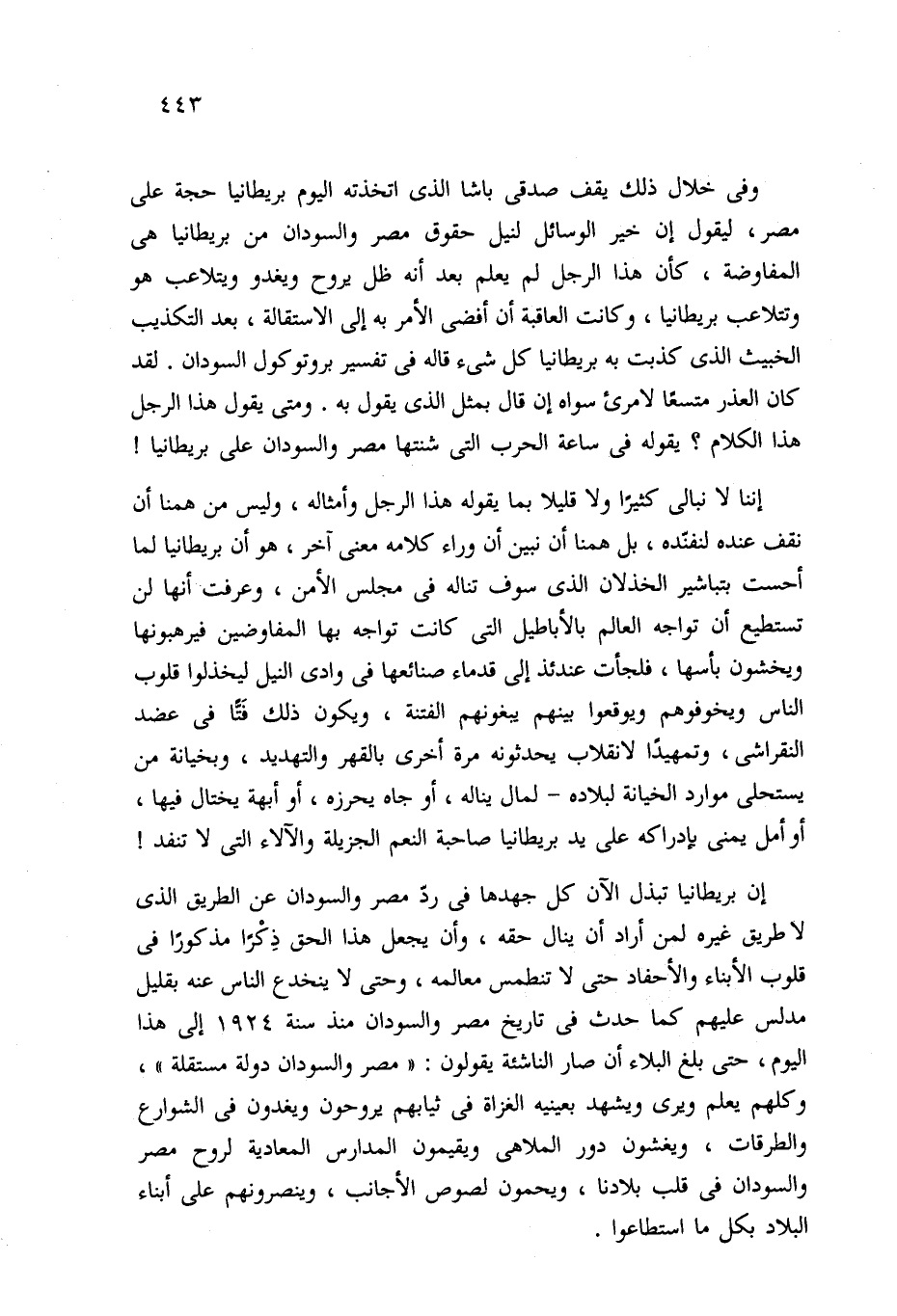 إن بريطانيا تبذل الآن كل جهدها في ردّ مصر والسودان عن الطريق الذي لا طريق غيره لمن أراد أن ينال حقه، وأن يجعل هذا الحق ذِكْرًا مذكورًا في قلوب الأبناء والأحفاد حتى لا تنطمس معالمه، وحتى لا ينخدع الناس عنه بقليل مدلس عليهم كما حدث في تاريخ مصر والسودان منذ سنة 1924 إلى هذا اليوم، حتى بلغ البلاء أن صار الناشئة يقولون: "مصر والسودان دولة مستقلة"، وكلهم يعلم ويرى ويشهد بعينيه الغزاة في ثيابهم يروحون ويغدون في الشوارع والطرقات، ويغشون دور الملاهي ويقيمون المدارس المعادية لروح مصر والسودان في قلب بلادنا، ويحمون لصوص الأجانب، وينصرونهم على أبناء البلاد بكل ما استطاعوا.