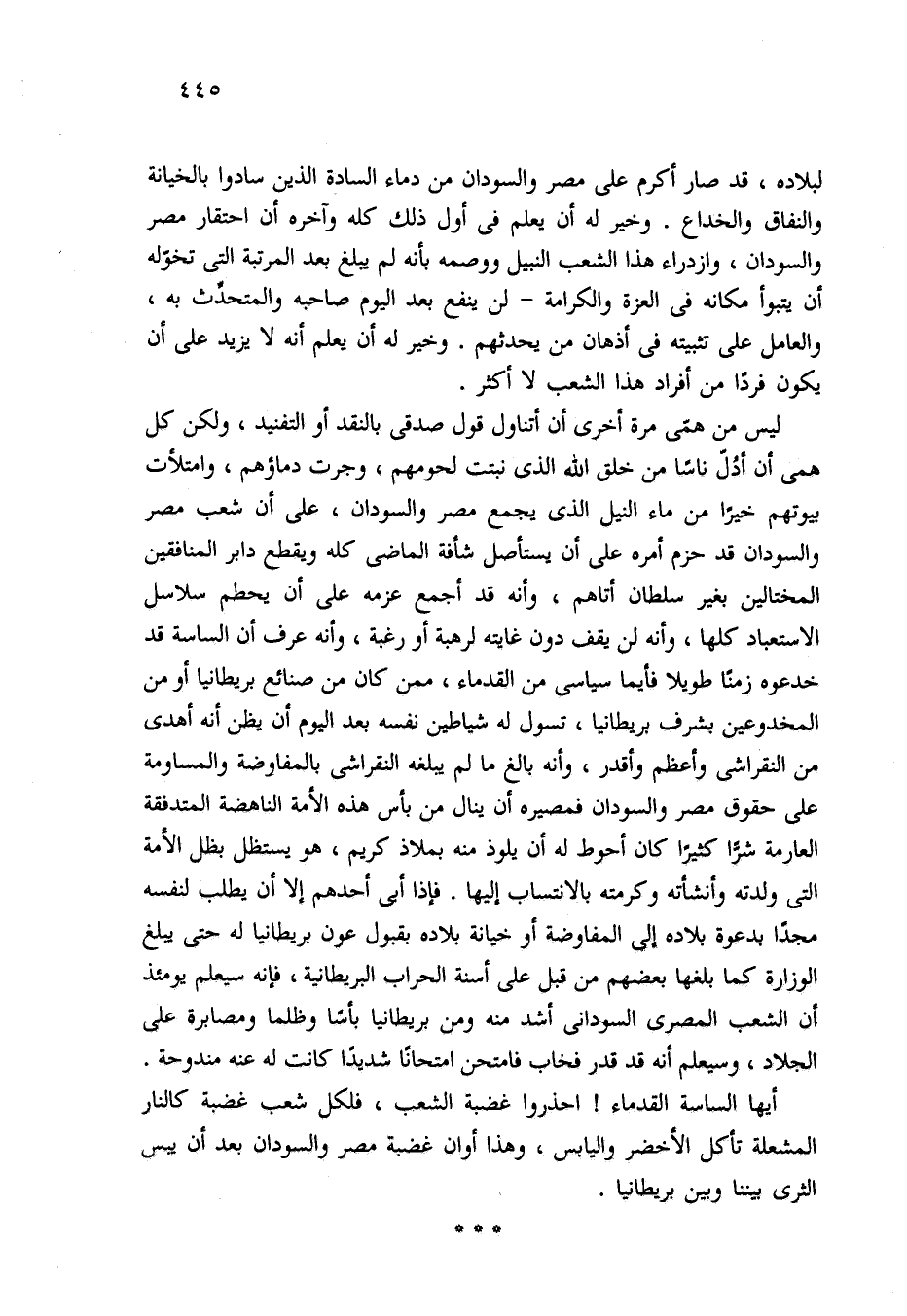 لبلاده، قد صار أكرم على مصر والسودان من دماء السادة الذين سادوا بالخيانة والنفاق والخداع. وخير له أن يعلم في أول ذلك كله وآخره أن احتقار مصر والسودان، وازدراء هذا الشعب النبيل ووصمه بأنه لم يبلغ بعد المرتبة التي تخوّله أن يتبوأ مكانه في العزة والكرامة -لن ينفع بعد اليوم صاحبه والمتحدِّث به، والعامل على تثبيته في أذهان من يحدثهم. وخير له أن يعلم أنه لا يزيد على أن يكون فردًا من أفراد هذا الشعب لا أكثر.