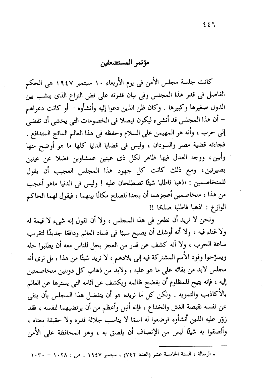 ونحن لا نريد أن نطعن في هذا المجلس، ولا أن نقول إنه شيء لا قيمة له ولا غناء فيه، ولا أنه أوشك أن يصبح سببًا في فساد العالم ودافعًا جديدًا لتقريب ساعة الحرب، ولا أنه كشف عن قدر من العجز يحل للناس معه أن يطلبوا حله ويسرِّحوا وفود الأمم المشتركة فيه إلى بلادهم، لا نريد شيئًا من هذا، بل نرى أنه مجلس لابد من بقائه على ما هو عليه، ولابد من ذهاب كل دولتين متخاصمتين إليه، فإنه يتيح للمظلوم أن يفضح ظالمه ويكشف عن آثامه التي يسترها عن العالم بالأكاذيب والتمويه. ولكن كل ما نريده هو أن يتفضل هذا المجلس بأن ينفي عن نفسه نقيصة الغش والخداع، فإنه أنبل وأعظم من أن يرتضيهما لنفسه، فقد زوّر عليه الذين أنشأوه فوضعوا له اسمًا لا يناسب جلالة قدره ولا حقيقة معناه، وألصقوا به شيئًا ليس من الإنصاف أن يلصق به، وهو المحافظة على الأمن