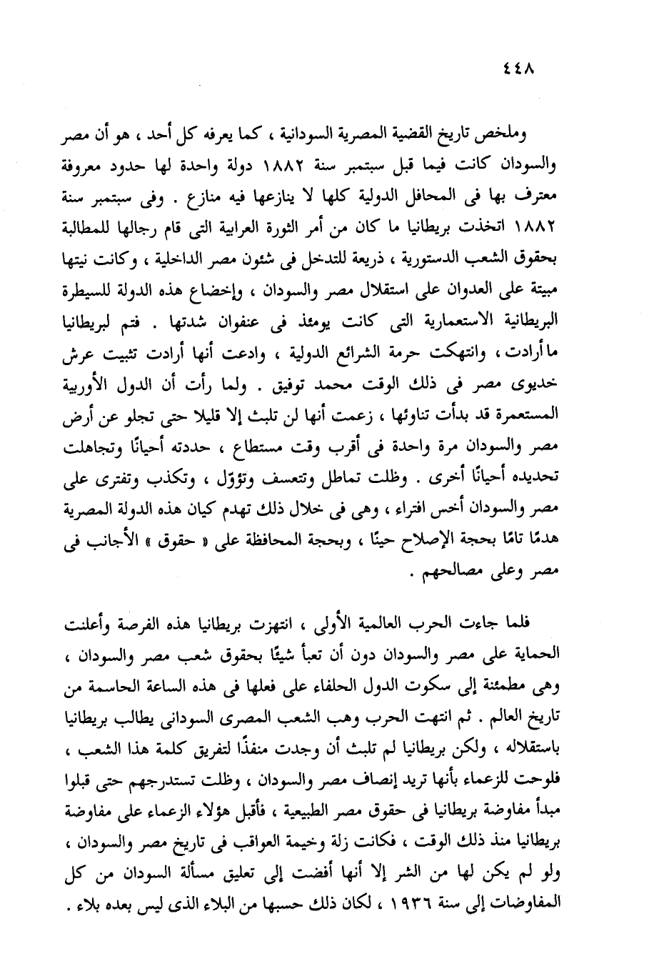 وملخص تاريخ القضية المصرية السودانية، كما يعرفه كل أحد، هو أن مصر والسودان كانت فيما قبل سبتمبر سنة 1882 دولة واحدة لها حدود معروفة معترف بها في المحافل الدولية كلها لا ينازعها فيه منازع. وفي سبتمبر سنة 1882 اتخذت بريطانيا ما كان من أمر الثورة العرابية التي قام رجالها للمطالبة بحقوق الشعب الدستورية، ذريعة للتدخل في شئون مصر الداخلية، وكانت نيتها مبيتة على العدوان على استقلال مصر والسودان، وإخضاع هذه الدولة للسيطرة البريطانية الاستعمارية التي كانت يومئذ في عنفوان شدتها. فتم لبريطانيا ما أرادت، وانتهكت حرمة الشرائع الدولية، وادعت أنها أرادت تثبيت عرش خديوي مصر في ذلك الوقت محمد توفيق. ولما رأت أن الدول الأوربية المستعمرة قد بدأت تناوئها، زعمت أنها لن تلبث إلا قليلا حتى تجلو عن أرض مصر والسودان مرة واحدة في أقرب وقت مستطاع، حددته أحيانًا وتجاهلت تحديده أحيانًا أخرى. وظلت تماطل وتتعسف وتؤوّل، وتكذب وتفترى على مصر والسودان أخس افتراء، وهي في خلال ذلك تهدم كيان هذه الدولة المصرية هدمًا تامًا بحجة الإصلاح حينًا، وبحجة المحافظة على "حقوق" الأجانب في مصر وعلى مصالحهم.