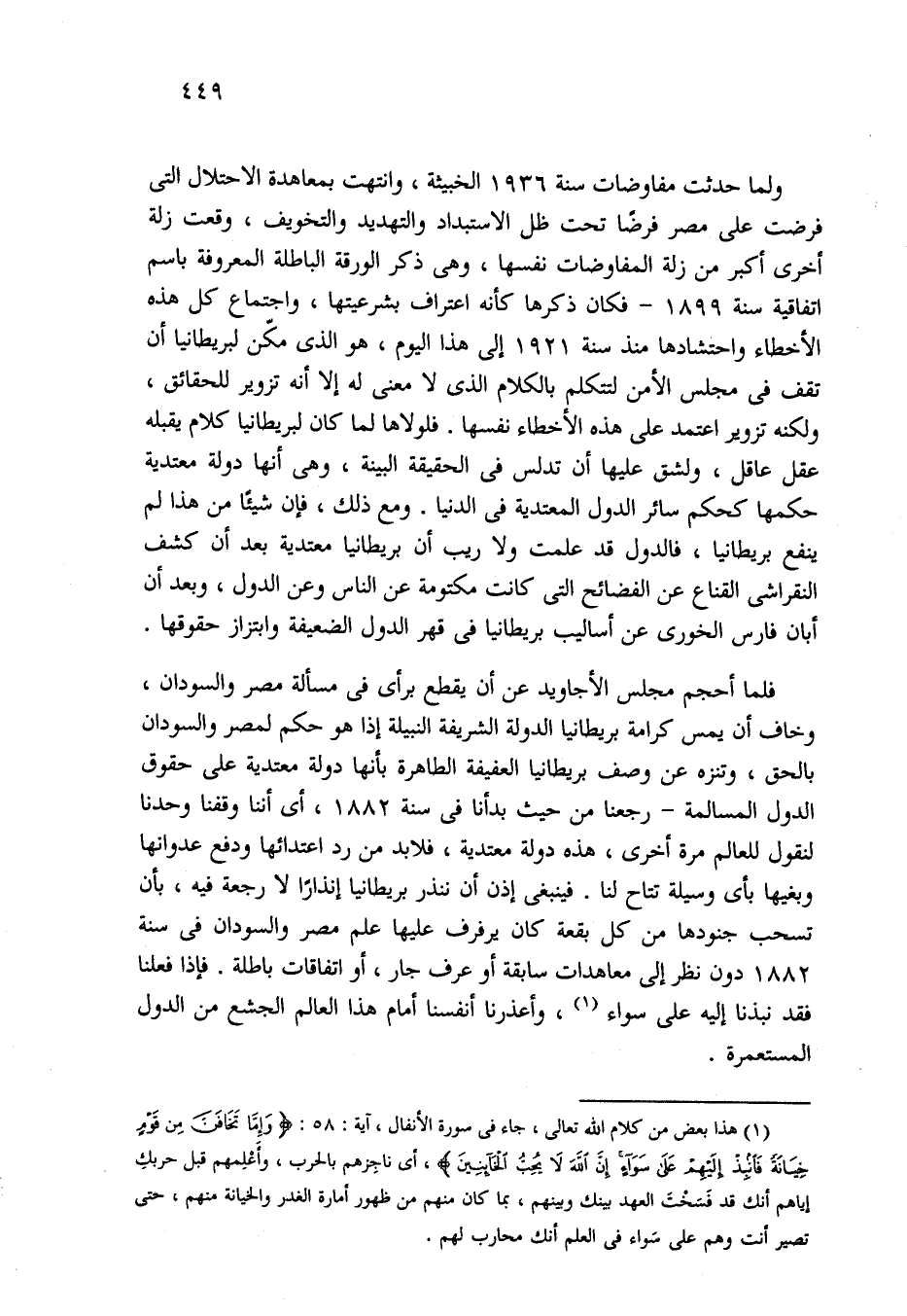 ولما حدثت مفاوضات سنة 1936 الخبيثة، وانتهت بمعاهدة الاحتلال التي فرضت على مصر فرضًا تحت ظل الاستبداد والتهديد والتخويف، وقعت زلة أخرى أكبر من زلة المفاوضات نفسها، وهي ذكر الورقة الباطلة المعروفة باسم اتفاقية سنة 1899 - فكان ذكرها كأنه اعتراف بشرعيتها، واجتماع كل هذه الأخطاء واحتشادها منذ سنة 1921 إلى هذا اليوم، هو الذي مكّن لبريطانيا أن تقف في مجلس الأمن لتتكلم بالكلام الذي لا معنى له إلا أنه تزوير للحقائق، ولكنه تزوير اعتمد على هذه الأخطاء نفسها. فلولاها لما كان لبريطانيا كلام يقبله عقل عاقل، ولشق عليها أن تدلس في الحقيقة البينة، وهي أنها دولة معتدية حكمها كحكم سائر الدول المعتدية في الدنيا. ومع ذلك، فإن شيئًا من هذا لم ينفع بريطانيا، فالدول قد علمت ولا ريب أن بريطانيا معتدية بعد أن كشف النقراشى القناع عن الفضائح التي كانت مكتومة عن الناس وعن الدول، وبعد أن أبان فارس الخوري عن أساليب بريطانيا في قهر الدول الضعيفة وابتزاز حقوقها.