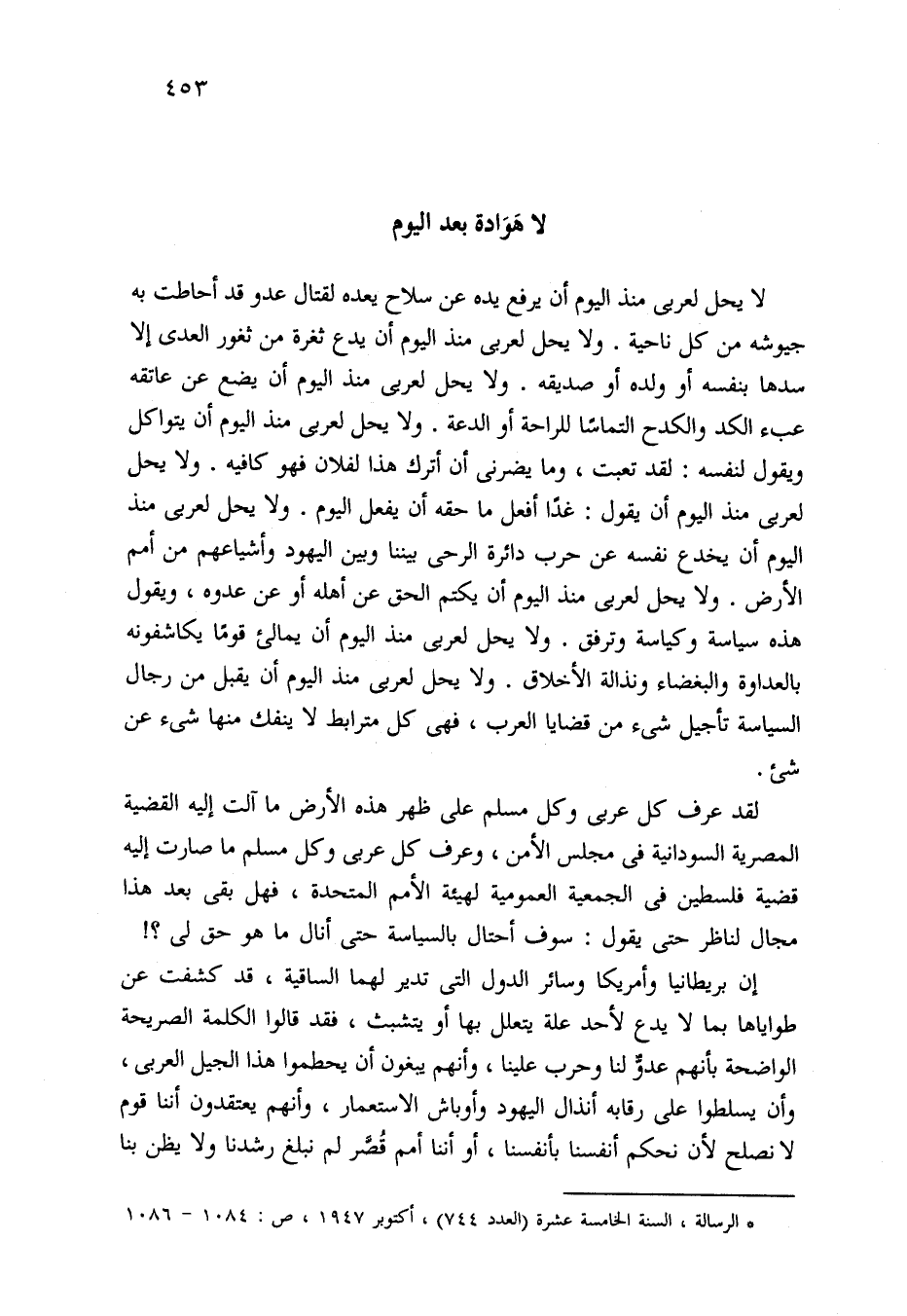 لا يحل لعربي منذ اليوم أن يرفع يده عن سلاح يعده لقتال عدو قد أحاطت به جيوشه من كل ناحية. ولا يحل لعربي منذ اليوم أن يدع ثغرة من ثغور العدى إلا سدها بنفسه أو ولده أو صديقه. ولا يحل لعربي منذ اليوم أن يضع عن عاتقه عبء الكد والكدح التماسًا للراحة أو الدعة. ولا يحل لعربي منذ اليوم أن يتواكل ويقول لنفسه: لقد تعبت، وما يضرنى أن أترك هذا لفلان فهو كافيه. ولا يحل لعربي منذ اليوم أن يقول: غدًا أفعل ما حقه أن يفعل اليوم. ولا يحل لعربي منذ اليوم أن يخدع نفسه عن حرب دائرة الرحى بيننا وبين اليهود وأشياعهم من أمم الأرض. ولا يحل لعربي منذ اليوم أن يكتم الحق عن أهله أو عن عدوه، ويقول هذه سياسة وكياسة وترفق. ولا يحل لعربي منذ اليوم أن يمالئ قومًا يكاشفونه بالعداوة والبغضاء ونذالة الأخلاق. ولا يحل لعربي منذ اليوم أن يقبل من رجال السياسة تأجيل شيء من قضايا العرب، فهي كل مترابط لا ينفك منها شيء عن شئ.