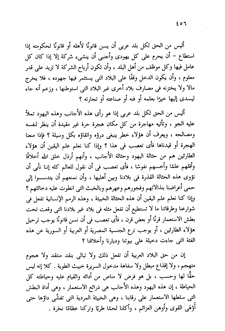 إن من حق البلاد العربية أن تفعل ذلك ولا تبالي بنقد منتقد ولا هجوم متهجم، ولا إقذاع مبطل ولا سفاهة مدخول السريرة خبيث الطوية. كلا إنه ليس حقًّا لها وحسب، بل هو فرض لا مناص من أدائه والقيام عليه وحياطته كل الحياطة، إن هذه اليهود وهذه الأجانب هي ذرائع الاستعمار، وهي أداة البطش التي سلطها الاستعمار على رقابنا، وهي الخبيثة المردية التي تفشَّى داؤها حتى أَوْهَى القوى وأوهن العزائم، وأكلنا لحمًا طريًا وتركنا عظامًا نخرة.