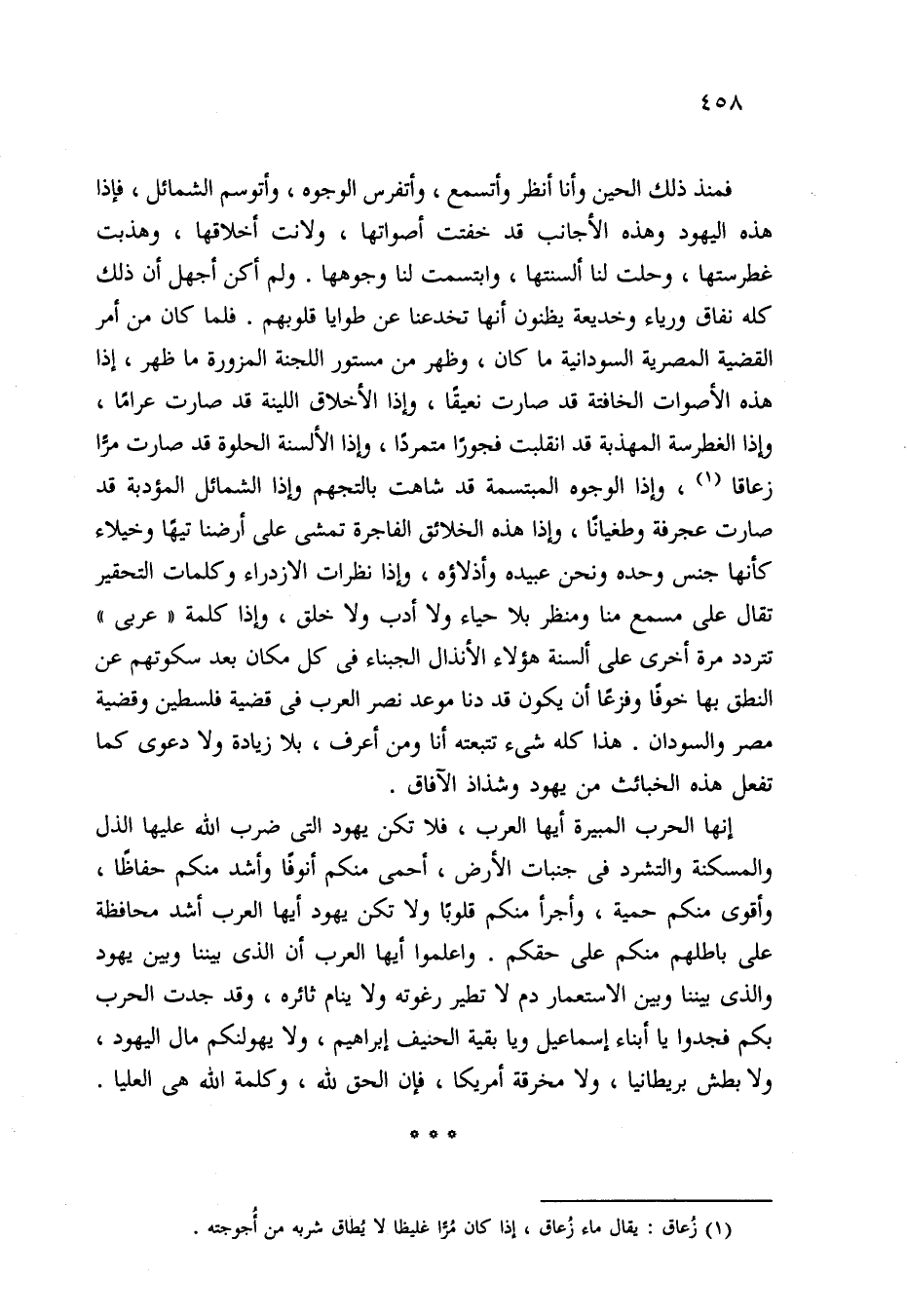 إنها الحرب المبيرة أيها العرب، فلا تكن يهود التي ضرب الله عليها الذل والمسكنة والتشرد في جنبات الأرض، أحمى منكم أنوفًا وأشد منكم حفاظًا، وأقوى منكم حمية، وأجرأ منكم قلوبًا ولا تكن يهود أيها العرب أشد محافظة على باطلهم منكم على حقكم. واعلموا أيها العرب أن الذي بيننا وبين يهود والذي بيننا وبين الاستعمار دم لا تطير رغوته ولا ينام ثائره، وقد جدت الحرب بكم فجدوا يا أبناء إسماعيل ويا بقية الحنيف إبراهيم، ولا يهولنكم مال اليهود، ولا بطش بريطانيا، ولا مخرقة أمريكا، فإن الحق لله، وكلمة الله هي العليا.