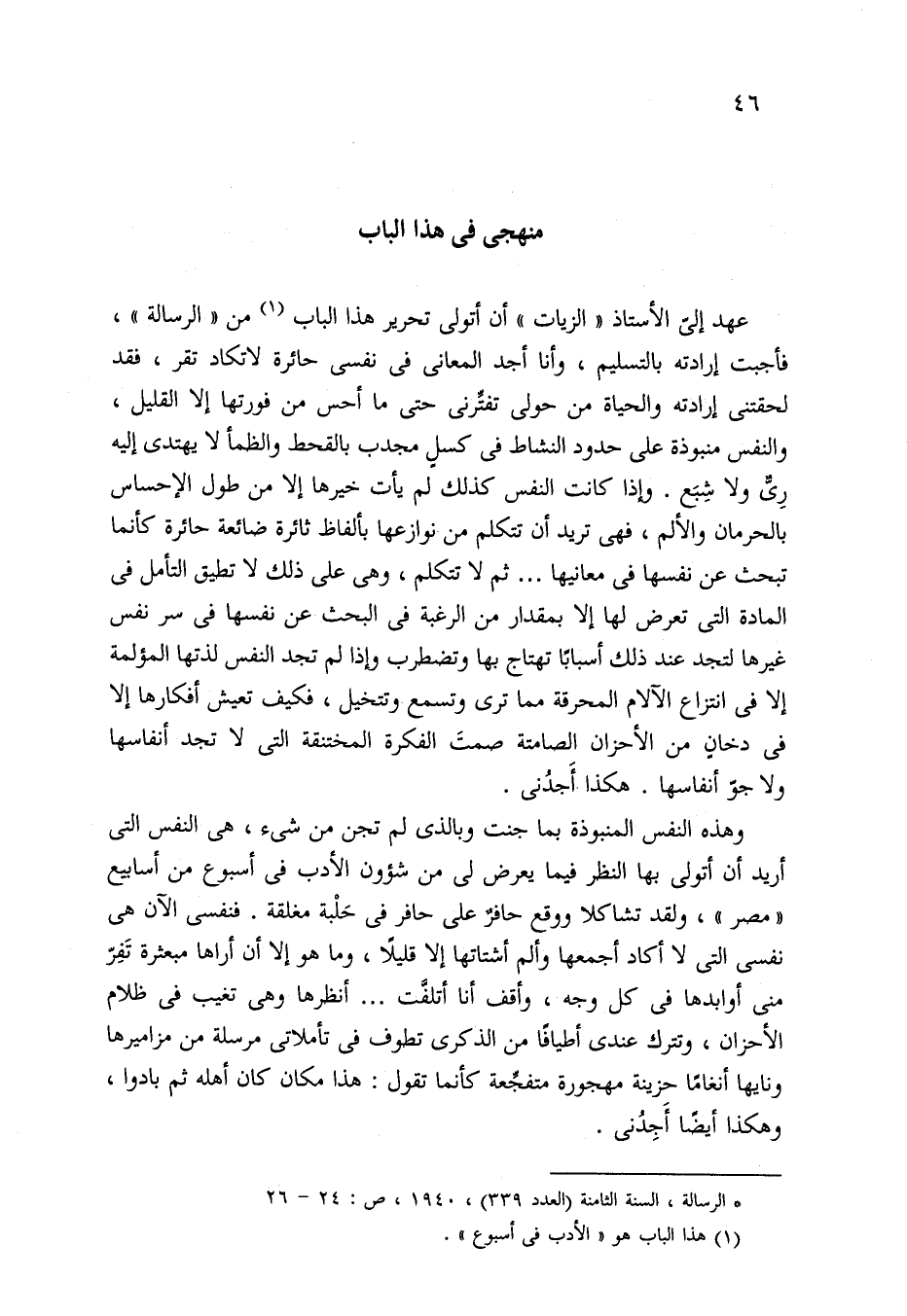 وهذه النفس المنبوذة بما جنت وبالذي لم تجن من شيء، هي النفس التي أريد أن أتولى بها النظر فيما يعرض لي من شؤون الأدب في أسبوع من أسابيع "مصر"، ولقد تشاكلا ووقع حافرٌ على حافر في حَلْبة مغلقة. فنفسي الآن هي نفسي التي لا أكاد أجمعها وألم أشتاتها إلا قليلًا، وما هو إلا أن أراها مبعثرة تَفِرّ مني أوابدها في كل وجه، وأقف أنا أتلفَت. . . . أنظرها وهي تغيب في ظلام الأحزان، وتترك عندي أطيافًا من الذكرى تطوف في تأملاتي مرسلة من مزاميرها ونايها أنغامًا حزينة مهجورة متفجعة كأنما تقول: هذا مكان كان أهله ثم بادوا، وهكذا أيضًا أَجِدُني.