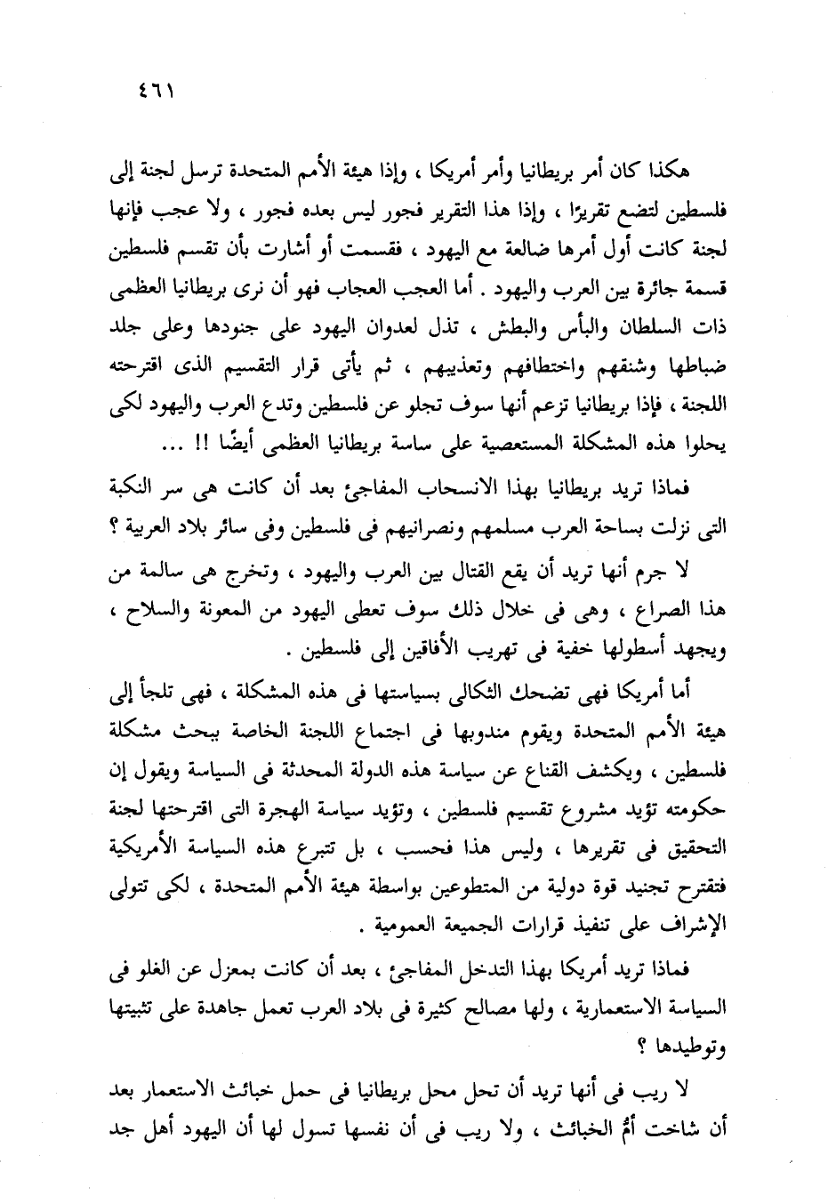 هكذا كان أمر بريطانيا وأمر أمريكا، وإذا هيئة الأمم المتحدة ترسل لجنة إلى فلسطين لتضع تقريرًا، وإذا هذا التقرير فجور ليس بعده فجور، ولا عجب فإنها لجنة كانت أول أمرها ضالعة مع اليهود، فقسمت أو أشارت بأن تقسم فلسطين قسمة جائرة بين العرب واليهود. أما العجب العجاب فهو أن نرى بريطانيا العظمى ذات السلطان والبأس والبطش، تذل لعدوان اليهود على جنودها وعلى جلد ضباطها وشنقهم واختطافهم وتعذيبهم، ثم يأتي قرار التقسيم الذي اقترحته اللجنة، فإذا بريطانيا تزعم أنها سوف تجلو عن فلسطين وتدع العرب واليهود لكي يحلوا هذه المشكلة المستعصية على ساسة بريطانيا العظمى أيضًا! ! . . .