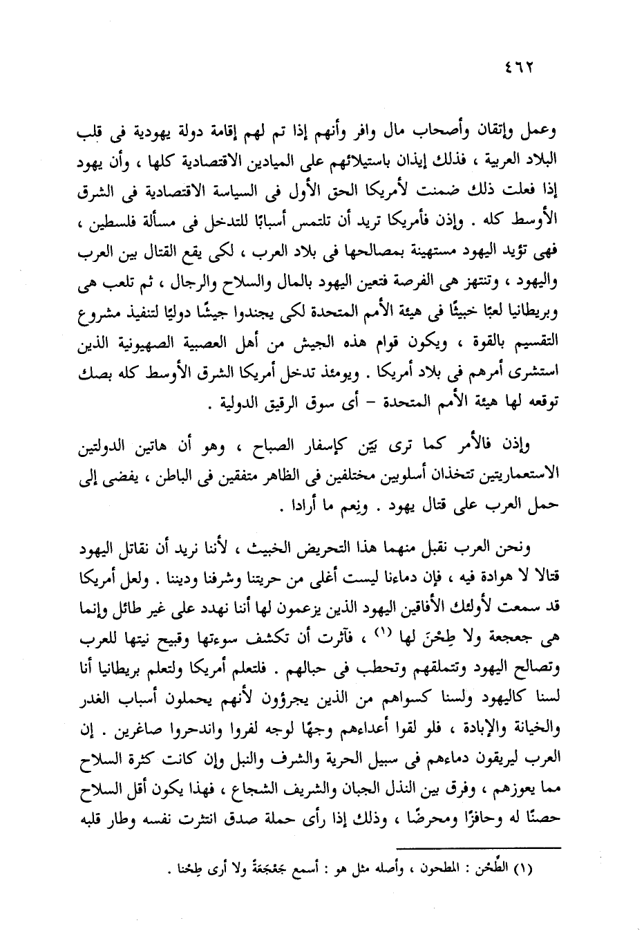 ونحن العرب نقبل منهما هذا التحريض الخبيث، لأننا نريد أن نقاتل اليهود قتالا لا هوادة فيه، فإن دماءنا ليست أغلى من حريتنا وشرفنا وديننا. ولعل أمريكا قد سمعت لأولئك الأفاقين اليهود الذين يزعمون لها أننا نهدد على غير طائل وإنما هي جعجعة ولا طِحْنَ لها (¬1)، فآثرت أن تكشف سوءتها وقبيح نيتها للعرب وتصالح اليهود وتتملقهم وتحطب في حبالهم. فلتعلم أمريكا ولتعلم بريطانيا أنا لسنا كاليهود ولسنا كسواهم من الذين يجرؤون لأنهم يحملون أسباب الغدر والخيانة والإبادة، فلو لقوا أعداءهم وجهًا لوجه لفروا واندحروا صاغرين. إن العرب ليريقون دماءهم في سبيل الحرية والشرف والنبل وإن كانت كثرة السلاح مما يعوزهم، وفرق بين النذل الجبان والشريف الشجاع، فهذا يكون أقل السلاح حصنًا له وحافزًا ومحرضًا، وذلك إذا رأى حملة صدق انتثرت نفسه وطار قلبه