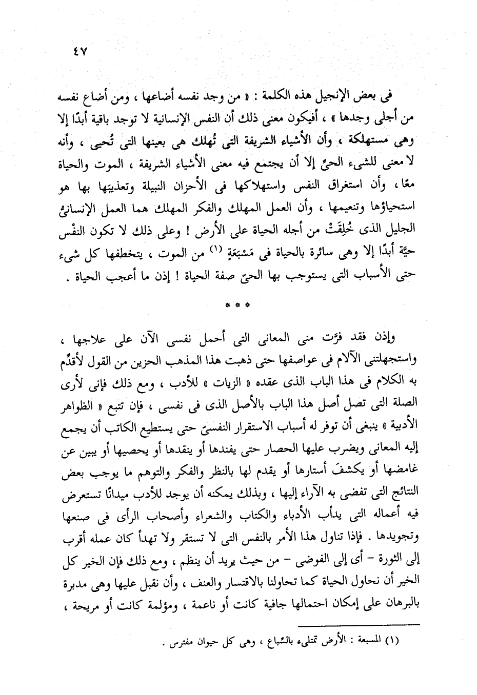 وإذن فقد فرَّت مني المعاني التي أحمل نفسي الآن على علاجها، واستجهلتني الآلام في عواصفها حتى ذهبت هذا المذهب الحزين من القول لأقدِّم به الكلام في هذا الباب الذي عقده "الزيات" للأدب، ومع ذلك فإني لأرى الصلة التي تصل أصل هذا الباب بالأصل الذي في نفسي، فإن تتبع "الظواهر الأدبية" ينبغي أن توفر له أسباب الاستقرار النفسي حتى يستطيع الكاتب أن يجمع إليه المعاني ويضرب عليها الحصار حتى يفندها أو ينقدها أو يحصيها أو يبين عن غامضها أو يكشفَ أستارها أو يقدم لها بالنظر والفكر والتوهم ما يوجب بعض النتائج التي تفضي به الآراء إليها، وبذلك يمكنه أن يوجد للأدب ميدانًا تستعرض فيه أعماله التي يدأب الأدباء والكتاب والشعراء وأصحاب الرأي في صنعها وتجويدها. فإذا تناول هذا الأمر بالنفس التي لا تستقر ولا تهدأ كان عمله أقرب إلى الثورة -أي إلى الفوضى- من حيث يريد أن ينظم، ومع ذلك فإن الخير كل الخير أن نحاول الحياة كما تحاولنا بالاقتسار والعنف، وأن نقبل عليها وهي مدبرة بالبرهان على إمكان احتمالها جافية كانت أو ناعمة، ومؤلمة كانت أو مريحة،