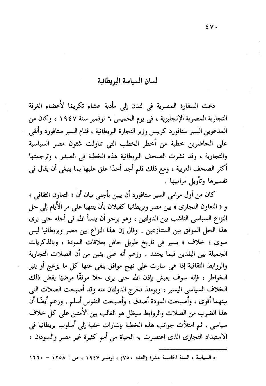 (*) السياسة، السنة الخامسة عشرة (العدد 750)، نوفمبر 1947، ص: 1258 - 1260