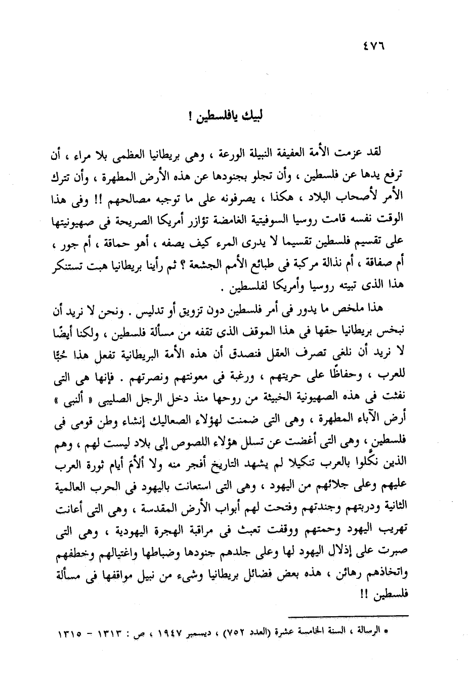 هذا ملخص ما يدور في أمر فلسطين دون تزويق أو تدليس. ونحن لا نريد أن نبخس بريطانيا حقها في هذا الموقف الذي تقفه من مسألة فلسطين، ولكنا أيضًا لا نريد أن نلغى تصرف العقل فنصدق أن هذه الأمة البريطانية تفعل هذا حُبًّا للعرب، وحفاظًا على حريتهم، ورغبة في معونتهم ونصرتهم. فإنها هي التي نفثت في هذه الصهيونية الخبيثة من روحها منذ دخل الرجل الصليبي "ألنبى" أرض الآباء المطهرة، وهي التي ضمنت لهؤلاء الصعاليك إنشاء وطن قومي في فلسطين، وهي التي أغضت عن تسلل هؤلاء اللصوص إلى بلاد ليست لهم، وهم الذين نكَّلوا بالعرب تنكيلا لم يشهد التاريخ أفجر منه ولا ألأمَ أيام ثورة العرب عليهم وعلى جلائهم من اليهود، وهي التي استعانت باليهود في الحرب العالمية الثانية ودربتهم وجندتهم وفتحت لهم أبواب الأرض المقدسة، وهي التي أعانت تهريب اليهود وحمتهم ووقفت تعبث في مراقبة الهجرة اليهودية، وهي التي صبرت على إذلال اليهود لها وعلى جلدهم جنودها وضباطها واغتيالهم وخطفهم واتخاذهم رهائن، هذه بعض فضائل بريطانيا وشيء من نبيل مواقفها في مسألة فلسطين! !