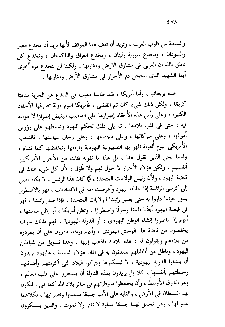 هذه بريطانيا، وأما أمريكا، فقد طالما ذهبت فى الدفاع عن الحرية مذهبًا كريمًا، ولكن ذلك شئ كان ثم انقضى، فأمريكا اليوم دولة تصرفها الأحقاد الكثيرة، وعلى رأس هذه الأحقاد إصرارها على التعصب البغيض إصرارًا لا هوادة فيه، حتى فى قلب بلادها. ثم يلي ذلك تحكم اليهود وتسلطهم على رؤوس أموالها، وعلى شركاتها، وعلى مجتمعها، وعلى رجال سياستها. فالشعب الأمريكى اليوم أُلعوبة تلهو بها الصهيونية اليهودية وترفعها وتخفضها كما تشاء، ولسنا نحن الذين نقول هذا، بل هذا ما تقوله فئات من الأحرار الأمريكيين أنفسهم، ولكن هؤلاء الأحرار لا حول لهم ولا طَوْل، لأن كل شيء هناك فى قبضة اليهود، ولأن رئيس الولايات المتحدة، أيًّا كان هذا الرئيس، لا يكاد يصل إلى كرسي الرئاسة إذا خذلته اليهود وأعرضت عنه في الانتخابات، فهو بالاضطرار يدور حيثما داروا به حتى يصير رئيسًا للولايات المتحدة، فإذا صار رئيسًا، فهو في قبضة اليهود أيضا طمعًا وخوفا واضطرارا. وتظن أمريكا، أو يظن ساستها، أنهم إذا ناصروا إنشاء الوطن اليهودي، أو الدولة اليهودية، فهم بذلك سوف يخلصون من قبضة هذا الوحش اليهودي، وأنهم يومئذ قادرون على أن يطردوه من بلادهم ويقولون له: هذه بلادك فاذهب إليها. وهذا تسويل من شياطين اليهود، وباطل من أباطيلهم يدندنون به في آذان هؤلاء الساسة، فاليهود يريدون أن ينشئوا الدولة اليهودية، لا ليسكنوها ويتركوا البلاد التي أكرمتهم وأضافتهم وخلطتهم بأنفسها، كلا بل يريدون بهذه الدولة أن يسيطروا على قلب العالم، وهو الشرق الأوسط، وأن يحتفظوا بسيطرتهم في سائر بلاد الله كما هي، ليكون لهم السلطان في الأرض، والغلبة على الأمم جميعًا مسلمها ونصرانيها، فكلاهما عدو لها، وهي تحمل لهما جميعًا عداوة لا تفتر ولا تموت. والذين يستنكرون