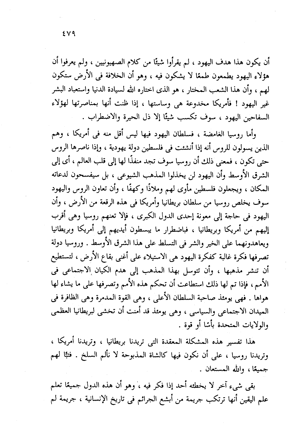 وأما روسيا الغامضة، فسلطان اليهود فيها ليس أقل منه في أمريكا، وهم الذين يسولون للروس أنه إذا أنشئت في فلسطين دولة يهودية، وإذا ناصرها الروس حتى تكون، فمعنى ذلك أن روسيا سوف تجد منفذًا لها إلى قلب العالم، أي إلى الشرق الأوسط وأن اليهود لن يخذلوا المذهب الشيوعي، بل سيفسحون لدعاته المكان، ويجعلون فلسطين مأوى لهم وملاذًا وكهفًا، وأن تعاون الروس واليهود سوف يخلص روسيا من سلطان بريطانيا وأمريكا في هذه الرقعة من الأرض، وأن اليهود في حاجة إلى معونة إحدى الدول الكبرى، فإلا تعنهم روسيا وهي أقرب إليهم من أمريكا وبريطانيا، فباضطرار ما يبسطون أيديهم إلى أمريكا وبريطانيا ويعاهدونهما على الخير والشر في التسلط على هذا الشرق الأوسط. وروسيا دولة تصرفها فكرة غالبة كفكرة اليهود هي الاستيلاء على أغنى بقاع الأرض، لتستطيع أن تنشر مذهبها، وأن تتوسل بهذا المذهب إلى هدم الكيان الاجتماعي في الأمم، فإذا تم لها ذلك استطاعت أن تحكم هذه الأمم وتصرفها على ما يشاء لها هواها. فهي يومئذ صاحبة السلطان الأعلى، وهي القوة المدمرة وهي الظافرة في الميدان الاجتماعي والسياسي، وهي يومئذ قد أمنت أن تخشى لبريطانيا العظمى والولايات المتحدة بأسًا أو قوة.