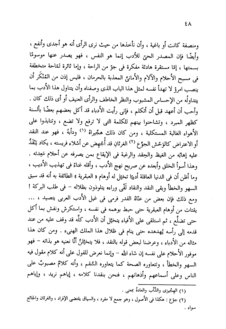 ومنصفة كانت أو باغية، وأن نأخذها من حيث نرى الرأي أنه هو أجدى وأنفع، وأيضا فإن المصدر الحىّ للأدب إنما هو النفس، فهو يصدر عنها موسومًا بسمتها، إمّا مستقرة هادئة مفكرة في جو من الراحة، وإما ثائرة لمّاحة متخطفة في مسبح الأحلام والآلام والأماني المعذبة بالحرمان، فليس إذن من المُنْكَر أن ينصب امرؤ لا تهدأ نفسه لمثل هذا الباب الذي وصفناه وأن يتناول هذا الأدب بما يتداولُه من الإحساس المشبوب والنظر الخاطف والرأي العنيف أو أي ذلك كان. وأحب أن أعهد قبل أن نكلم، فإني رأيت الأدباء قد أكل بعضهم بعضًا بألسنة كظهر المبرد، وتشاحنوا بينهم للكلمة التي لا ترفع ولا تضع، وتنابذوا على الأهواء الغالبة المستكلبة، ومن كان ذلك هجيراه (¬1) ودأبهُ، فهو عند النقد أو الاعتراض كالوَحش الجوع (¬2) الغرثانِ قد أُجْهِض عن أشلاء فريسته، يكاد يَنْقَد عليه إهابُه من الغيظ والحِقد والرغبة في الإيقاع بمن يصرفه عن أحلام مَعِدته. وهذا أسوأ الخلق وأبعده عن صريح نهج الأدب، وأقله غناءً في تهذيب الأديب، وما أظن أن في الدنيا العاقلة أديبا تخيّل له أوهام "العبقرية" الطائفة به أنه قد سبق السهو والخطأ وبقى النقد والنقاد لَقًى وراءه يتلوذون بظلاله -في طلب البركة! ومع ذلك فإن بعض من عناه القدر فرمى في غيل الأدب العربي يتصيد، . . . . يقتات من أوهام العبقرية حتى حبط بوهمه في نفسه، واستكرش ونفش بما أكل حتى تضلَّع، ثم استلقى على الأفياء يتخيَّل أن الأدب كله قد وقف عليه من عند قدمه إلى رأسه يُهدهده حتى ينام في ظلال هذا الملك الهنئ. ومن كان هذا مثاله من الأدباء، وعرضنا لبعض قوله بالنقد، فلا يتخيلن أنَا نعنيه هو بذاته- فهو موفور الأحلام على نفسه إن شاء الله -وإنما نعرض للقول على أنه كلام مقول فيه السهو والخطأ، وتتعاوره الصحة كما يتعاوره السقم، وأنه كلامٌ مصبوبٌ على الناس وعلى أسماعهم وأذهانهم، فنحن بنقدنا كلامه، إياهم نريد، وإياهم