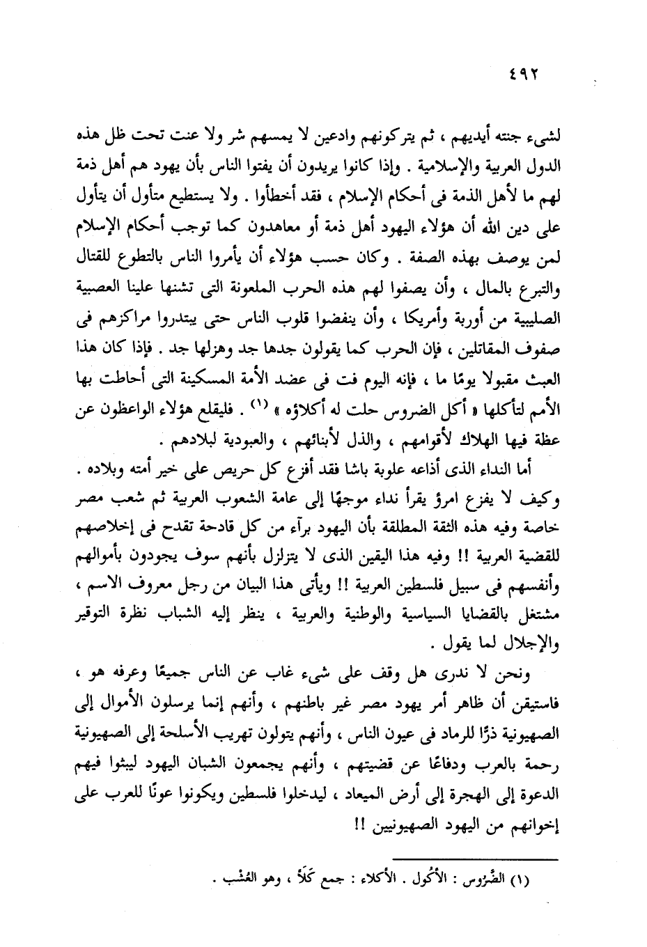 لشيء جنته أيديهم، ثم يتركونهم وادعين لا يمسهم شر ولا عنت تحت ظل هذه الدول العربية والإسلامية. وإذا كانوا يريدون أن يفتوا الناس بأن يهود هم أهل ذمة لهم ما لأهل الذمة في أحكام الإسلام، فقد أخطأوا. ولا يستطيع متأول أن يتأول على دين الله أن هؤلاء اليهود أهل ذمة أو معاهدون كما توجب أحكام الإسلام لمن يوصف بهذه الصفة. وكان حسب هؤلاء أن يأمروا الناس بالتطوع للقتال والتبرع بالمال، وأن يصفوا لهم هذه الحرب الملعونة التي تشنها علينا العصبية الصليبية من أوربة وأمريكا، وأن ينفضوا قلوب الناس حتى يبتدروا مراكزهم في صفوف المقاتلين، فإن الحرب كما يقولون جدها جد وهزلها جد. فإذا كان هذا العبث مقبولا يومًا ما، فإنه اليوم فت في عضد الأمة المسكينة التي أحاطت بها الأمم لتأكلها "أكل الضروس حلت له أكلاؤه" (¬1). فليقلع هؤلاء الواعظون عن عظة فيها الهلاك لأقوامهم، والذل لأبنائهم، والعبودية لبلادهم.