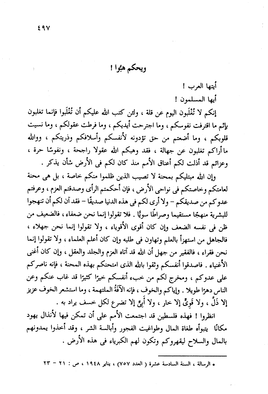 (*) الرسالة، السنة السادسة عشرة (العدد 757)، يناير 1948، ص: 21 - 23