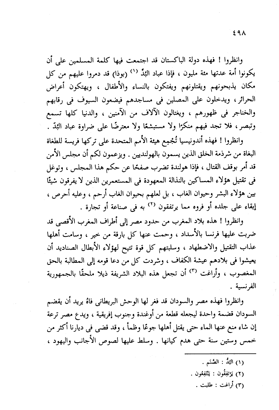 وانظروا فهذه مصر والسودان قد فغر لها الوحش البريطاني فاهُ يريد أن يقضم السودان قضمة واحدة ليجعله قطعة من أوغندة وجنوب إفريقية، ويدع مصر ترعة إن شاء منع عنها الماء حتى يقتل أهلها جوعًا وظمأ، وقد قضى في ديارنا أكثر من خمس وستين سنة حتى هدم كيانها. وسلط عليها لصوص الأجانب واليهود،
