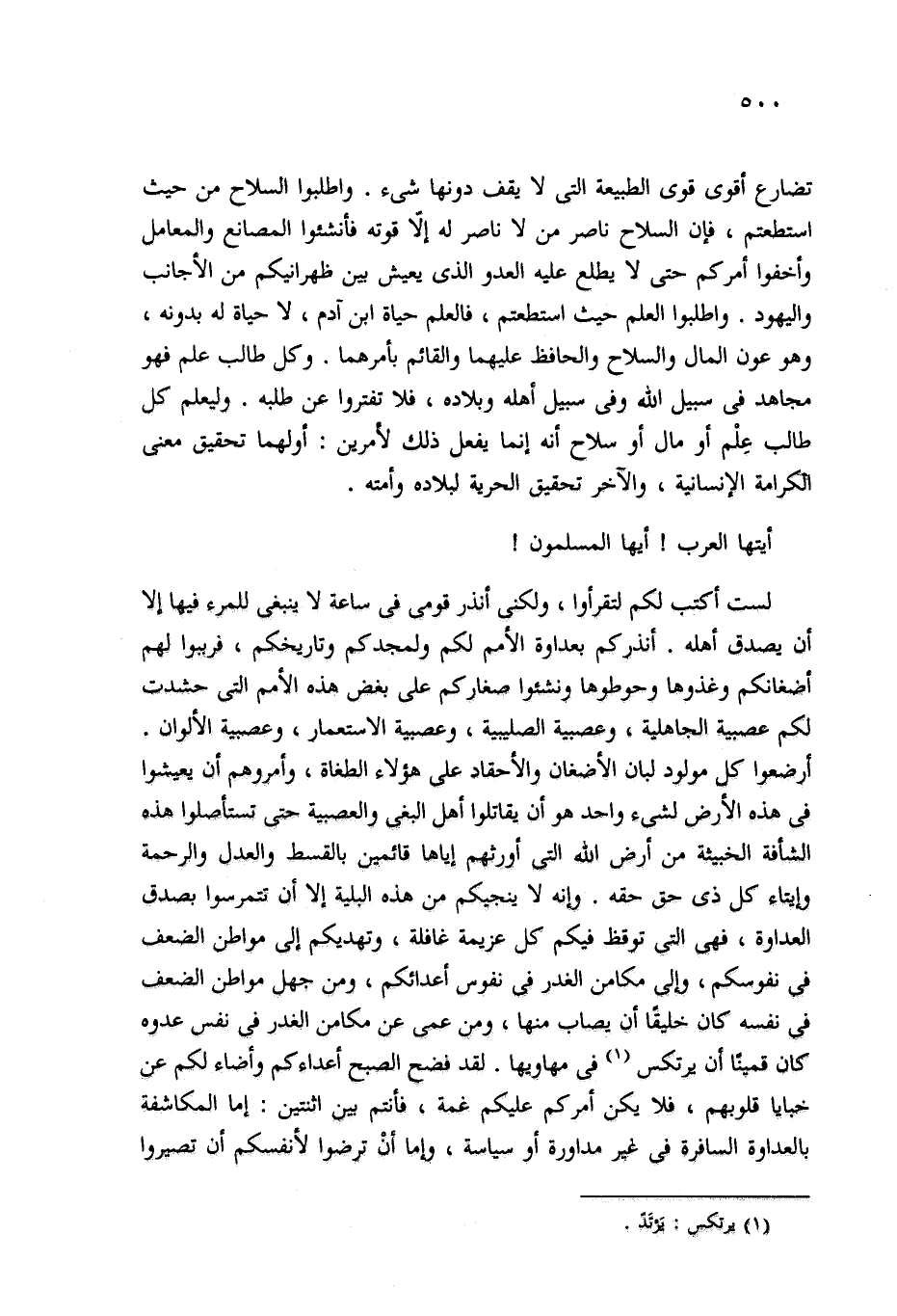 تضارع أقوى قوي الطبيعة التي لا يقف دونها شيء. واطلبوا السلاح من حيث استطعتم، فإن السلاح ناصر من لا ناصر له إلّا قوته فأنشئوا المصانع والمعامل وأخفوا أمركم حتى لا يطلع عليه العدو الذي يعيش بين ظهرانيكم من الأجانب واليهود. واطلبوا العلم حيث استطعتم، فالعلم حياة ابن آدم، لا حياة له بدونه، وهو عون المال والسلاح والحافظ عليهما والقائم بأمرهما. وكل طالب علم فهو مجاهد في سبيل الله وفي سبيل أهله وبلاده، فلا تفتروا عن طلبه. وليعلم كل طالب عِلْم أو مال أو سلاح أنه إنما يفعل ذلك لأمرين: أولهما تحقيق معني الكرامة الإنسانية، والآخر تحقيق الحرية لبلاده وأمته.