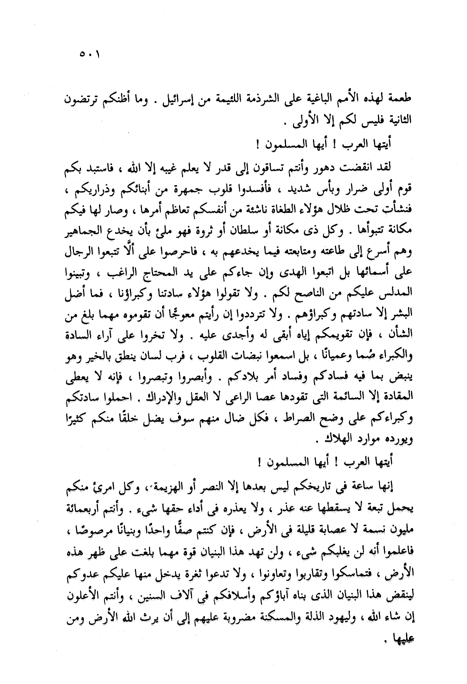 إنها ساعة في تاريخكم ليس بعدها إلا النصر أو الهزيمة، وكل امرئ منكم يحمل تبعة لا يسقطها عنه عذر، ولا يعذره في أداء حقها شيء. وأنتم أربعمائة مليون نسمة لا عصابة قليلة في الأرض، فإن كنتم صفًّا واحدًا وبنيانًا مرصوصًا، فاعلموا أنه لن يغلبكم شيء، ولن تهد هذا البنيان قوة مهما بلغت على ظهر هذه الأرض، فتماسكوا وتقاربوا وتعاونوا، ولا تدعوا ثغرة يدخل منها عليكم عدوكم لينقض هذا البنيان الذي بناه آباؤكم وأسلافكم في آلاف السنين، وأنتم الأعلون إن شاء الله، وليهود الذلة والمسكنة مضروبة عليهم إلى أن يرث الله الأرض ومن عليها.