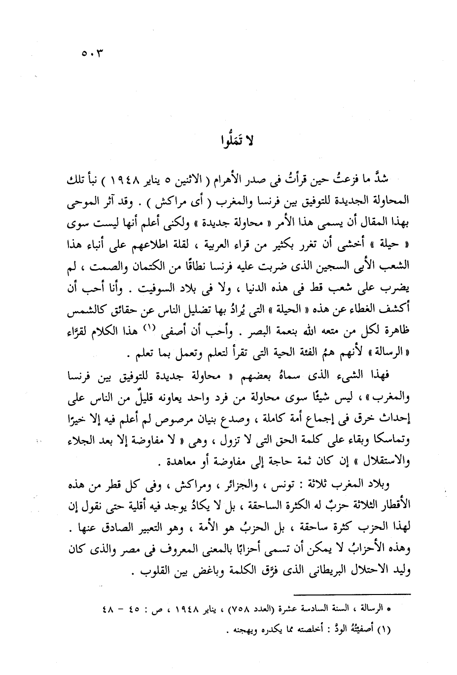 شدَّ ما فزعتُ حين قرأتُ في صدر الأهرام (الاثنين 5 يناير 1948) نبأ تلك المحاولة الجديدة للتوفيق بين فرنسا والمغرب (أي مراكش). وقد آثر الموحي بهذا المقال أن يسمى هذا الأمر "محاولة جديدة" ولكني أعلم أنها ليست سوى "حيلة" أخشى أن تغرر بكثير من قراء العربية، لقلة اطلاعهم على أنباء هذا الشعب الأبي السجين الذي ضربت عليه فرنسا نطاقًا من الكتمان والصمت، لم يضرب على شعب قط في هذه الدنيا، ولا في بلاد السوفيت. وأنا أحب أن أكشف الغطاء عن هذه "الحيلة" التي يُرادُ بها تضليل الناس عن حقائق كالشمس ظاهرة لكل من متعه الله بنعمة البصر. وأحب أن أصفي (¬1) هذا الكلام لقرَّاء "الرسالة" لأنهم همُ الفئة الحية التي تقرأ لتعلم وتعمل بما تعلم.