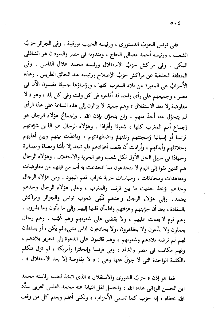 ففي تونس الحزبُ الدستورى، ورئيسه الحبيب بورقيبة. وفي الجزائر حزبُ الشعب، ورئيسه أحمد مصالى الحاج، ومندوبه في مصر والسودان هو الشاذلي المكى. وفي مراكش حزبُ الاستقلال ورئيسه محمد علال الفاسي. وفي المنطقة الخليفية عن مراكش حزبُ الإصلاح ورئيسه عبد الخالق الطريس. وهذه الأحزابُ هي المعبره عن بلاد المغرب كلها، ورؤساؤها جميعًا مقيمون الآن في مصر، وجميعهم على رأي واحد قد أذاعوه في كل وقت وفي كل بلد، وهو "لا مفاوضة إلا بعد الاستقلال" وهم جميعًا لايزالون إلى هذه الساعة على هذا الرأي لم يتحوَّل عنه أحدٌ منهم، ولن يتحوَّل بإذن الله. وإجماعُ هؤلاء الرجال هو إجماع أمم المغرب كلها، شعوبًا وأفرادًا. وهؤلاء الرجال هم الذين شرَّدتهم فرنسا أو إسبانيا وَسجنتهم ونفتهمْ واضطهدتهم، وباعدَت بينهم وبين أهليهم وحلائلهم وأبنائهم، وأرادت أن تقصم أعوادهم فلم تجد إلا بأسًا ومضاءً ومصابرة وجهادًا في سبيل الحق الأول لكل شعب وهو الحرية والاستقلال. وهؤلاء الرجال هم الذين بقوا إلى اليوم لا ينخدعون بما انخدعت به أمم من قبلهم من مفاوضات ومعاهدات ومحادثات، وسياسات خربة خراب ذمم اليهود. ومن هؤلاء الرجال وحدهم يؤخذ حديث ما بين فرنسا والمغرب، وعلى هؤلاء الرجال وحدهم يعتمد، وإلى هؤلاء الرجال وحدهم تُلْقِى شعوب تونس والجزائر ومراكش بالمقادة، بعد أن جرَّبتهم وعرَفتهم واطمأن قلبها إليهم وإلى ما يأتون وما يذرون. وهم قوم لا يفتات عليهم، ولا يقضى على شعوبهم وهم غُيَّب. وهم رجال يعملون ولا يدَّعون ولا يتظاهرون، ولا يخادعون الناس بشيء لم يكن، أو بسلطان لهم لم ترضه بلادهم وشعوبهم، وهم قائمون على الدعوة إلى تحرير بلادهم، ولهم مكاتب في مصر والشام، وفي فرنسا وإنجلترا وأمريكا، لم تزل تتكلم بالكلمة الواحدة التي لا حِوَلَ عنها وهي: "لا مفاوضة إلا بعد الاستقلال".