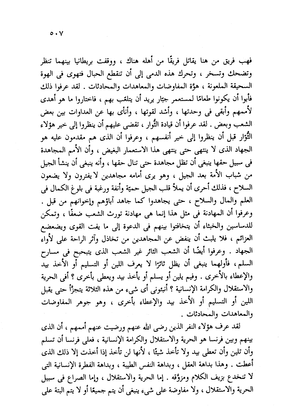 لقد عرف هؤلاء النفر الذين رضي الله عنهم ورضيت عنهم أممهم، أن الذي بينهم وبين فرنسا هو الحرية والاستقلال والكرامة الإنسانية، فعلى فرنسا أن تسلم وأن تلين وأن تعطي بيد ولا تأخذ شيئًا، لأنها لن تأخذ إذا أخذت إلا ذلك الذي أعطت. وهذا بداهة العقل، وبداهة النفس الطيبة، وبداهة الفطرة الإنسانية التي لا تنخدع بزيف الكلام ومزوَّقه. إما الحرية والاستقلال، وإما الصراع في سبيل الحرية والاستقلال، ولا مفاوضة على شيء ينبغي أن يتم جميعًا أو لا يتم البتة على