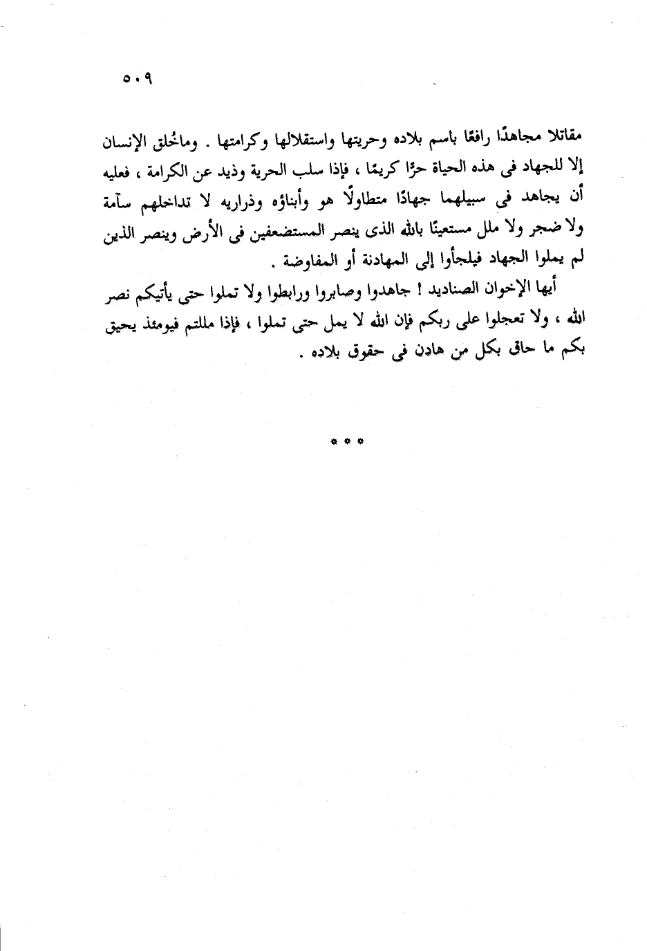 مقاتلا مجاهدًا رافعًّا باسم بلاده وحريتها واستقلالها وكرامتها. وما خُلق الإنسان إلا للجهاد في هذه الحياة حرًّا كريمًا، فإذا سلب الحرية وذيد عن الكرامة، فعليه أن يجاهد في سبيلهما جهادًا متطاولًا هو وأبناؤه وذراريه لا تداخلهم سآمة ولا ضجر ولا ملل مستعينًا بالله الذي ينصر المستضعفين في الأرض وينصر الذين لم يملوا الجهاد فيلجأوا الى المهادنة أو المفاوضة.