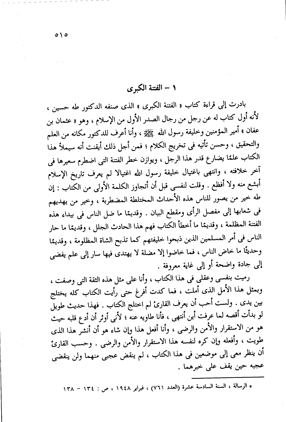 بادرت إلى قراءة كتاب "الفتنة الكبرى" الذي صنفه الدكتور طه حسين، لأنه أول كتاب له عن رجل من رجال الصدر الأول من الإسلام، وهو "عثمان بن عفان" أمير المؤمنين وخليفة رسول الله - صلى الله عليه وسلم -، وأنا أعرف للدكتور مكانه من العلم والتحقيق، وحسن تأتيه في تخريج الكلام؛ فمن أجل ذلك أيقنت أنه سيملأ هذا الكتاب علمًا يضارع قدر هذا الرجل، ويوازن خطر الفتنة التي اضطرم سعيرها في آخر خلافته، وانتهى باغتيال خليفة رسول الله اغتيالا لم يعرف تاريخ الإسلام أبشع منه ولا أفظع. وقلت لنفسي قبل أن أتجاوز الكلمة الأولى من الكتاب: إن طه خير من يصور للناس هذه الأحداث المختلطة المضطربة، وخير من يهديهم في شعابها إلى مفصل الرأي ومقطع البيان. وقديمًا ما ضل الناس في بيداء هذه الفتنة المظلمة، وقديمًا ما أخطأ الكتاب فهم هذا الحادث الجلل، وقديمًا ما حار الناس في أمر المسلمين الذين ذبحوا خليفتهم كما تذبح الشاة المظلومة، وقديمًا وحديثًا ما خاض الناس، فما خاضوا إلا مضلة لا يهتدى فيها سار إلى علم يفضى إلى جادة واضحة أو إلى غاية معروفة.