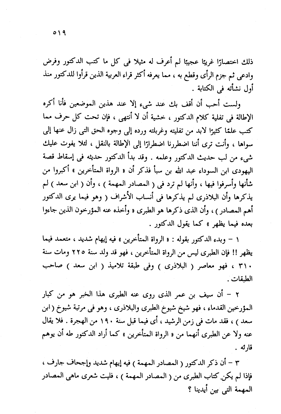 2 - أن سيف بن عمر الذي روى عنه الطبري هذا الخبر هو من كبار المؤرخين القدماء، فهو شيخ شيوخ الطبري والبلاذري، وهو في مرتبة شيوخ (ابن سعد)، فقد مات في زمن الرشيد، أي فيما قبل سنة 190 من الهجرة. فلا يقال عنه ولا عن الطبري أنهما من "الرواة المتأخرين" كما أراد الدكتور طه أن يوهم قارئه.