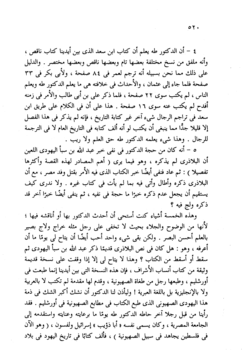 وهذه الخمسة أشياء كنت أستحي أن أحدث الدكتور بها أو أناقشه فيها؛ لأنها من الوضوح والجلاء بحيث لا تخفى على رجل مثله خراج ولاج بصير بالعلم أحسن البصر. ولكن بقى شيء واحد أحب أيضًا أن يتاح لي يومًا ما أن أعرفه، وهو: هل كان في نص البلاذرى قديمًا ذكر عبد الله بن سبأ اليهودي ثم سقط أو أسقط من الكتاب؟ وهذا لا يتاح لي إلا إذا وقفت على نسخة قديمة وثيقة من كتاب أنساب الأشراف، فإن هذه النسخة التي بين أيدينا إنما طبعت في أورشليم، وطبعها رجل من طغاة الصهيونية، وقدم لها مقدمة لم تكتب لا بالعربية ولا بالإنجليزية بل باللغة العبرية! وليأذن لنا الدكتور أن نشك أكبر الشك في ذمة هذا اليهودي الصهيوني الذي طبع الكتاب في مطابع الصهيونية في أورشليم. فقد رأينا من قبل رجلا آخر حاطه الدكتور طه يومًا ما برعايته وعنايته واستقدمه إلى الجامعة المصرية، وكان يسمي نفسه "أبا ذؤيب" إسرائيل ولفسون، (وهو الآن في فلسطين يجاهد في سبيل الصهيونية)، فألف كتابًا في تاريخ اليهود في بلاد