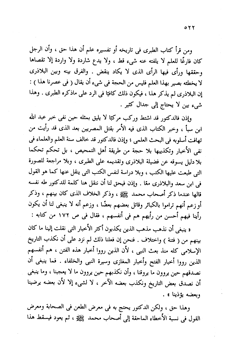 ومن قرأ كتاب الطبري في تاريخه أو تفسيره علم أن هذا حق، وأن الرجل كان فارغًا للعلم لا يلفته عنه شيء قط، ولا يدع شاردة ولا واردة إلا تقصاها وحققها ورأى فيها الرأي الذي لا يكاد ينقض. والفرق بينه وبين البلاذرى لا يخطئه بصير بهذا العلم فليس من الحجة في شيء أن يقال (في عصرنا هذا): إن البلاذرى لم يذكر هذا، فيكون ذلك كافيًا في الرد على ما ذكره الطبري. وهذا شيء بين لا يحتاج إلى جدال كثير.