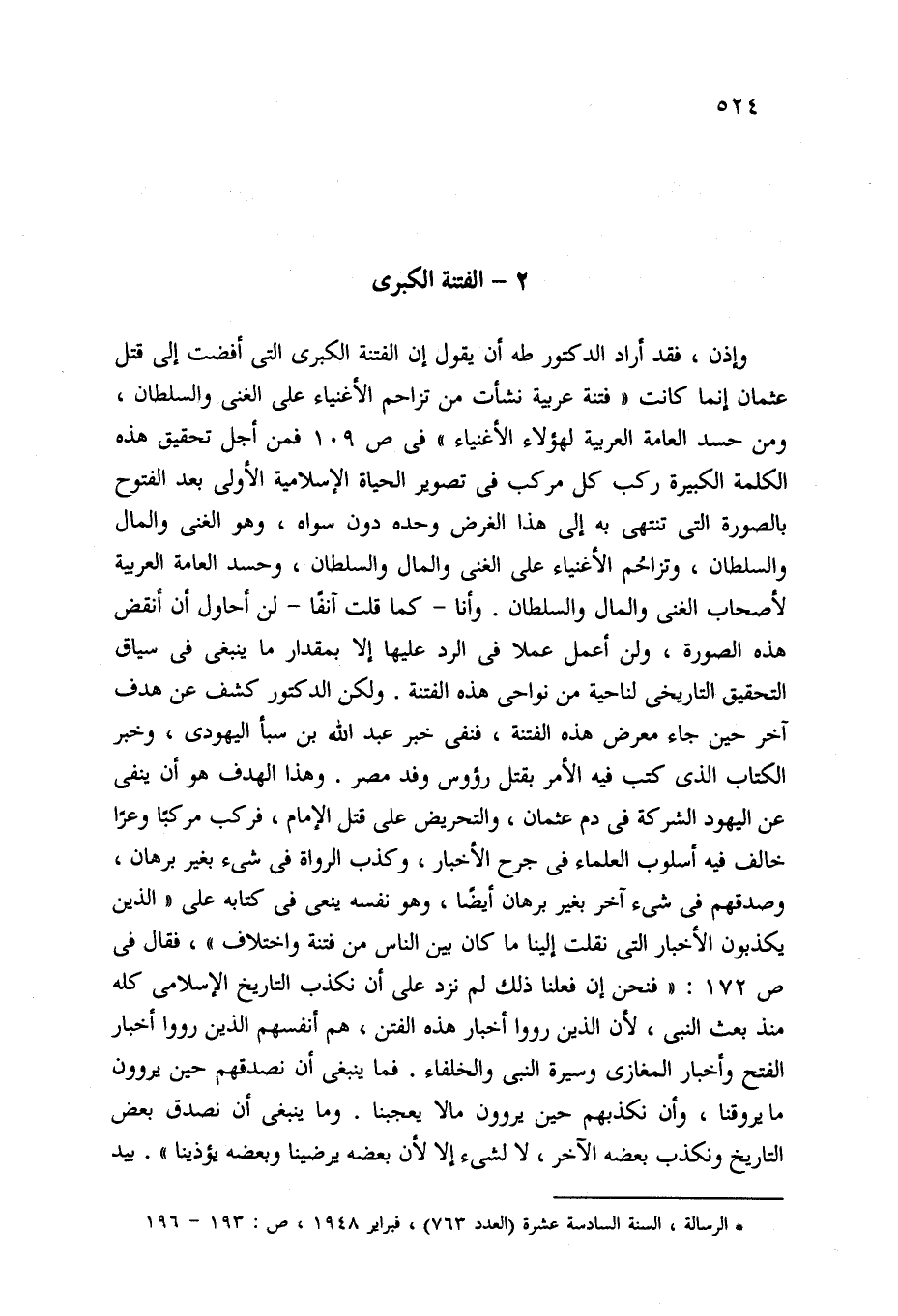 وإذن، فقد أراد الدكتور طه أن يقول إن الفتنة الكبرى التي أفضت إلى قتل عثمان إنما كانت "فتنة عربية نشأت من تزاحم الأغنياء على الغنى والسلطان، ومن حسد العامة العربية لهؤلاء الأغنياء" في ص 109 فمن أجل تحقيق هذه الكلمة الكبيرة ركب كل مركب في تصوير الحياة الإسلامية الأولى بعد الفتوح بالصورة التي تنتهي به إلى هذا الغرض وحده دون سواه، وهو الغنى والمال والسلطان، وتزاحُم الأغنياء على الغنى والمال والسلطان، وحسد العامة العربية لأصحاب الغنى والمال والسلطان. وأنا -كما قلت آنفًا- لن أحاول أن أنقض هذه الصورة، ولن أعمل عملا في الرد عليها إلا بمقدار ما ينبغي في سياق التحقيق التاريخي لناحية من نواحي هذه الفتنة. ولكن الدكتور كشف عن هدف آخر حين جاء معرض هذه الفتنة، فنفى خبر عبد الله بن سبأ اليهودي، وخبر الكتاب الذي كتب فيه الأمر بقتل رؤوس وفد مصر. وهذا الهدف هو أن ينفي عن اليهود الشركة في دم عثمان، والتحريض على قتل الإمام، فركب مركبًا وعرًا خالف فيه أسلوب العلماء في جرح الأخبار، وكذب الرواة في شيء بغير برهان، وصدقهم في شيء آخر بغير برهان أيضًا، وهو نفسه ينعى في كتابه على "الذين يكذبون الأخبار التي نقلت إلينا ما كان بين الناس من فتنة واختلاف"، فقال في ص 172: "فنحن إن فعلنا ذلك لم نزد على أن نكذب التاريخ الإسلامي كله منذ بعث النبي، لأن الذين رووا أخبار هذه الفتن، هم أنفسهم الذين رووا أخبار الفتح وأخبار المغازي وسيرة النبي والخلفاء. فما ينبغي أن نصدقهم حين يروون ما يروقنا، وأن نكذبهم حين يروون ما لا يعجبنا. وما ينبغي أن نصدق بعض التاريخ ونكذب بعضه الآخر، لا لشيء إلا لأن بعضه يرضينا وبعضه يؤذينا". بيد