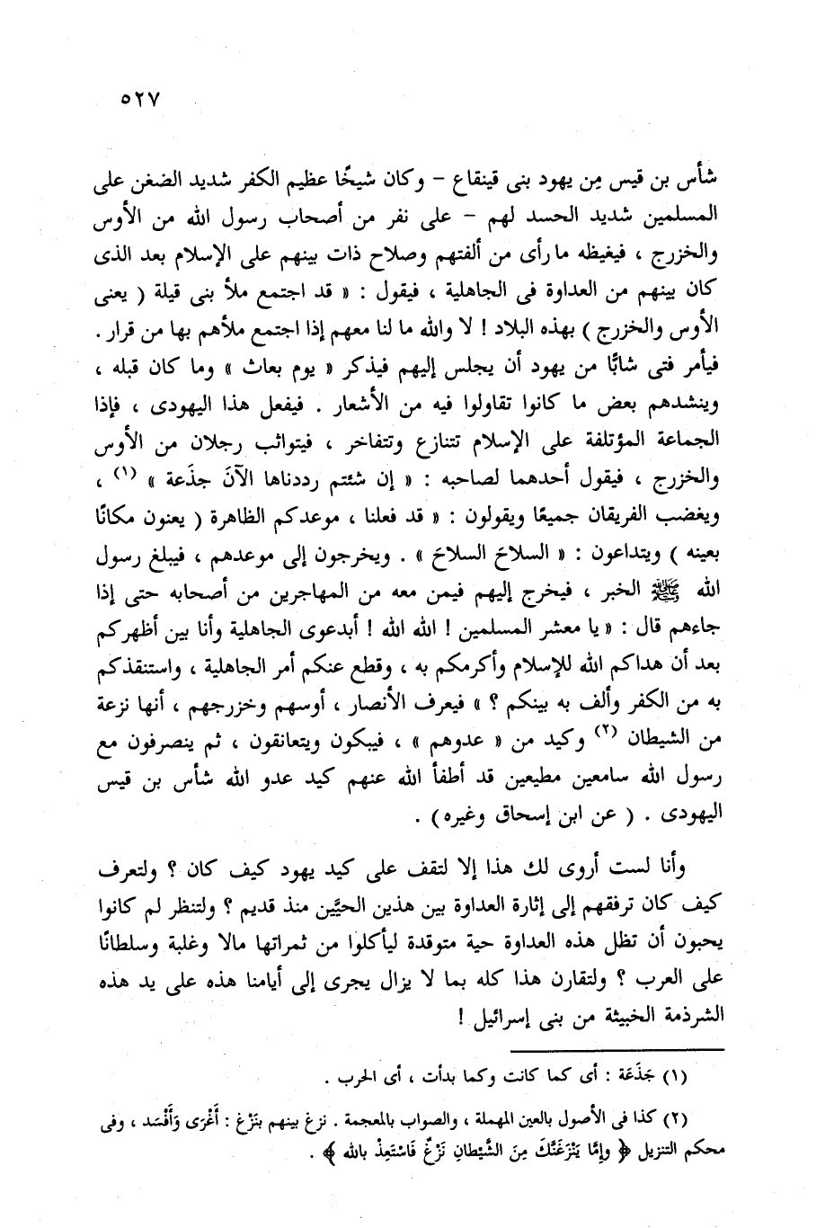 وأنا لست أروى لك هذا إلا لتقف على كيد يهود كيف كان؟ ولتعرف كيف كان ترفقهم إلى إثارة العداوة بين هذين الحيَّين منذ قديم؟ ولتنظر لم كانوا يحبون أن تظل هذه العداوة حية متوقدة ليأكلوا من ثمراتها مالا وغلبة وسلطانًا على العرب؟ ولتقارن هذا كله بما لا يزال يجرى إلى أيامنا هذه على يد هذه الشرذمة الخبيثة من بني إسرائيل!