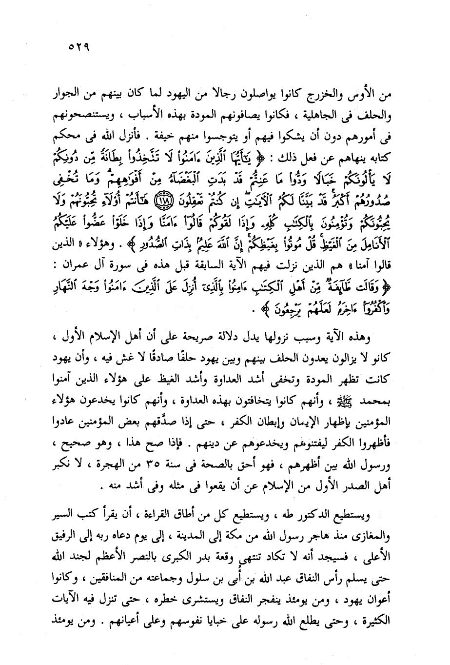 ويستطيع الدكتور طه، ويستطيع كل من أطاق القراءة، أن يقرأ كتب السير والمغازى منذ هاجر رسول الله من مكة إلى المدينة، إلى يوم دعاه ربه إلى الرفيق الأعلى، فسيجد أنه لا تكاد تنتهي وقعة بدر الكبرى بالنصر الأعظم لجند الله حتى يسلم رأس النفاق عبد الله بن أُبي بن سلول وجماعته من المنافقين، وكانوا أعوان يهود، ومن يومئذ ينفجر النفاق ويستشرى خطره، حتى تنزل فيه الآيات الكثيرة، وحتى يطلع الله رسوله على خبايا نفوسهم وعلى أعيانهم. ومن يومئذ