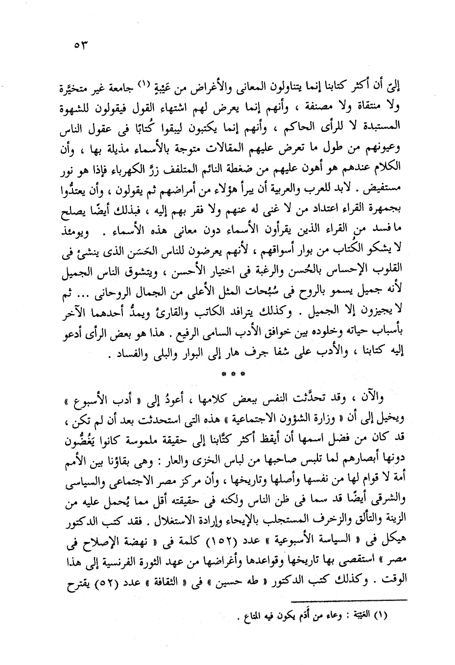 إلي أن أكثر كتابنا إنما يتناولون المعاني والأغراض من عَيبةٍ (¬1) جامعة غير متخيَّرة ولا منتقاة ولا مصنفة، وأنهم إنما يعرض لهم اشتهاء القول فيقولون للشهوة المستبدة لا للرأي الحاكم، وأنهم إنما يكتبون ليبقوا كُتابًا في عقول الناس وعيونهم من طول ما تعرض عليهم المقالات متوجة بالأسماء مذيلة بها، وأن الكلام عندهم هو أهون عليهم من ضغطة النائم المتلفف زرَّ الكهرباء فإذا هو نور مستفيض. لابد للعرب والعربية أن يبرأ هؤلاء من أمراضهم ثم يقولون، وأن يعتدوا بجمهرة القراء اعتداد من لا غنى له عنهم ولا فقر بهم إليه، فبذلك أيضًا يصلح ما فسد من القراء الذين يقرأون الأسماء دون معاني هذه الأسماء. ويومئذ لا يشكو الكُتاب من بوار أسواقهم، لأنهم يعرضون للناس الحَسَن الذي ينشئ في القلوب الإحساس بالحُسن والرغبة في اختيار الأحسن، ويتشوق الناس الجميل لأنه جميل يسمو بالروح في سُبحات المثل الأعلى من الجمال الروحاني. . . ثم لا يجيزون إلا الجميل. وكذلك يترافد الكاتب والقارئ ويمدُّ أحدهما الآخر بأسباب حياته وخلوده لكن خوافق الأدب السامي الرفيع. هذا هو بعض الرأي أدعو إليه كتابنا، والأدب على شفا جرف هار إلى البوار والبلى والفساد.