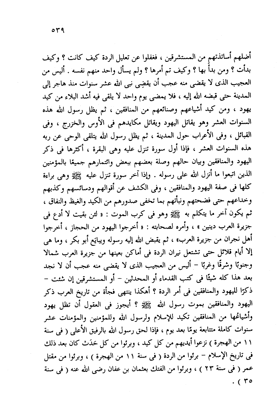 أضلهم أساتذتهمِ من المستشرقين، فغفلوا عن تعليل الردة كيف كانت؟ وكيف بدأت؟ ومن بدأ بها؟ وكيف تم أمرها؟ ولم يسأل واحد منهم نفسه. أليس من العجيب الذي لا يقضى منه عجب أن يقضِي نبي الله عشر سنوات منذ هاجر إلى المدينة حتى قبضه الله إليه، فلا يمضي يوم واحد لا يلقى فيه أشد البلاء من كيد يهود، ومن كيد أشياعهم وصنائعهم من المنافقين، ثم يظل رسول الله هذه السنوات العشر وهو يقاتل اليهود ويقاتل مكايدهم في الأوس والخزرج، وفي القبائل، وفي الأعراب حول المدينة، ثم يظل رسول الله يتلقى الوحي عن ربه هذه السنوات العشر، فإذا أول سورة تنزل عليه وهي البقرة، أكثرها في ذكر اليهود والمنافقين وبيان حالهم وصلة بعضهم ببعض وائتمارهم جميعًا بالمؤمنين الذين اتبعوا ما أنزل الله على رسوله. وإذا آخر سورة تنزل عليه - صلى الله عليه وسلم - وهي براءة كلها في صفة اليهود والمنافقين، وفي الكشف عن أقوالهم ودسائسهم وكذبهم وخداعهم حتى فضحتهم ونبأتهم بما تخفي صدورهم من الكيد والغيظ والنفاق، ثم يكون آخر ما يتكلم به - صلى الله عليه وسلم - وهو في كرب الموت: "لئن بقيت لا أدع في جزيرة العرب دينين"، وأمره لصحابته: "أخرجوا اليهود من الحجاز، أخرجوا أهل نجران من جزيرة العرب"، ثم يقبض الله إليه رسوله ويبايَع أبو بكر، وما هي إلا أيام قلائل حتى تشتعل نيران الردة في أماكن بعينها من جزيرة العرب شمالا وجنوبًا وشرقًا وغربًا -أليس من العجيب الذي لا يقضى منه عجب أن لا نجد بعد هذا كله شيئًا في كتب القدماء أو المحدثين -أو المستشرقين إن شئت- ذكرًا لليهود والمنافقين في أمر الردة؟ أهكذا ينتهي فجأة من تاريخ العرب ذكر اليهود والمنافقين بموت رسول الله - صلى الله عليه وسلم -؟ أيجوز في العقول أن تظل يهود وأشياعُها من المنافقين تكيد للإسلام ولرسول الله وللمؤمنين والمؤمنات عشر سنوات كاملة متتابعة يومًا بعد يوم، فإذا لحق رسول الله بالرفيق الأعلى (في سنة 11 من الهجرة) نزعوا أيديهم من كل كيد، وبرئوا من كل حَدَث كان بعد ذلك في تاريخ الإسلام- برئوا من الردة (في سنة 11 من الهجرة)، وبرئوا من مقتل عمر (في سنة 23)، وبرئوا من الفتك بعثمان بن عفان - رضي الله عنه - (في سنة 35).