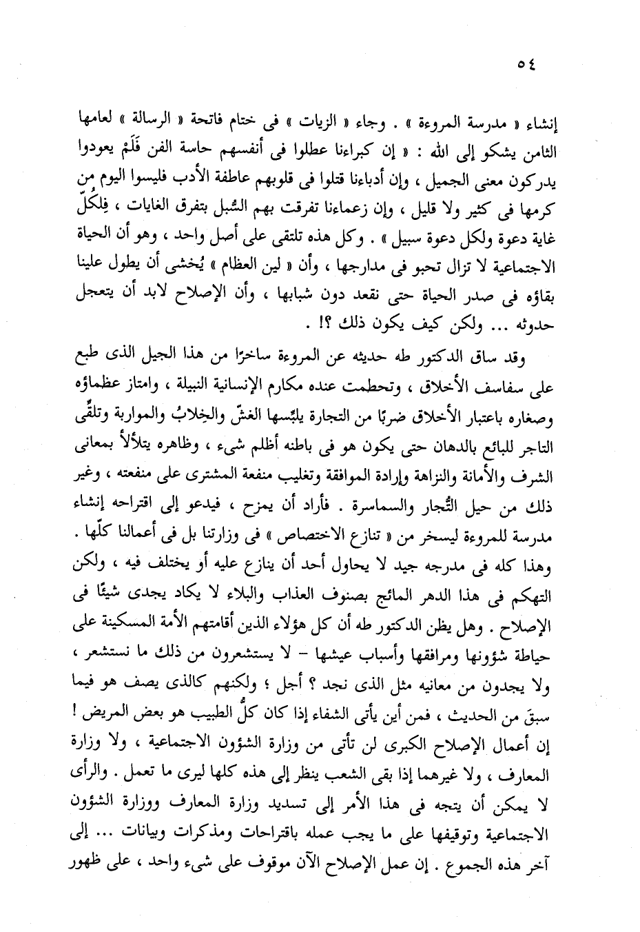 وقد ساق الدكتور طه حديثه عن المروءة ساخرًا من هذا الجيل الذي طبع على سفاسف الأخلاق، وتحطمت عنده مكارم الإنسانية النبيلة، وامتاز عظماؤه وصغاره باعتبار الأخلاق ضربًا من التجارة يلبِّسها الغش والخِلابُ والمواربة وتلقِّي التاجر للبائع بالدهان حتى يكون هو في باطنه أظلم شيء، وظاهره يتلألأ بمعاني الشرف والأمانة والنزاهة وإرادة الموافقة وتغليب منفعة المشتري على منفعته، وغير ذلك من حيل التُّجار والسماسرة. فأراد أن يمزح، فيدعو إلى اقتراحه إنشاء مدرسة للمروءة ليسخر من "تنازع الاختصاص" في وزارتنا بل في أعمالنا كلّها. وهذا كله في مدرجه جيد لا يحاول أحد أن ينازع عليه أو يختلف فيه، ولكن التهكم في هذا الدهر المائج بصنوف العذاب والبلاء لا يكاد يجدي شيئًا في الإصلاح. وهل يظن الدكتور طه أن كل هؤلاء الذين أقامتهم الأمة المسكينة على حياطة شؤونها ومرافقها وأسباب عيشها -لا يستشعرون من ذلك ما نستشعر، ولا يجدون من معانيه مثل الذي نجد؟ أجل؛ ولكنهم كالذي يصف هو فيما سبقَ من الحديث، فمن أين يأتي الشفاء إذا كان كلُّ الطبيب هو بعض المريض! إن أعمال الإصلاح الكبرى لن تأتي من وزارة الشؤون الاجتماعية، ولا وزارة المعارف، ولا غيرهما إذا بقى الشعب ينظر إلى هذه كلها ليرى ما تعمل. والرأي لا يمكن أن يتجه في هذا الأمر إلى تسديد وزارة المعارف ووزارة الشؤون الاجتماعية وتوقيفها على ما يجب عمله باقتراحات ومذكرات وبيانات. . . . إلى آخر هذه الجموع. إن عمل الإصلاح الآن موقوف على شيء واحد، على ظهور