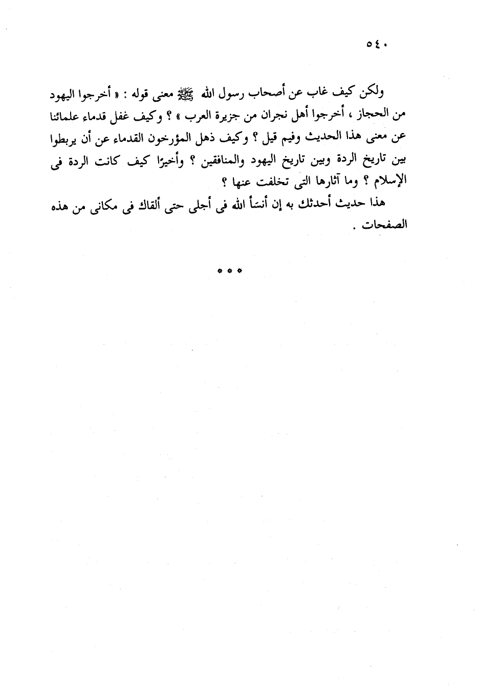 ولكن كيف غاب عن أصحاب رسول الله - صلى الله عليه وسلم - معنى قوله: "أخرجوا اليهود من الحجاز، أخرجوا أهل نجران من جزيرة العرب"؟ وكيف غفل قدماء علمائنا عن معنى هذا الحديث وفيم قيل؟ وكيف ذهل المؤرخون القدماء عن أن يربطوا بين تاريخ الردة وبين تاريخ اليهود والمنافقين؟ وأخيرًا كيف كانت الردة في الإسلام؟ وما آثارها التي تخلفت عنها؟