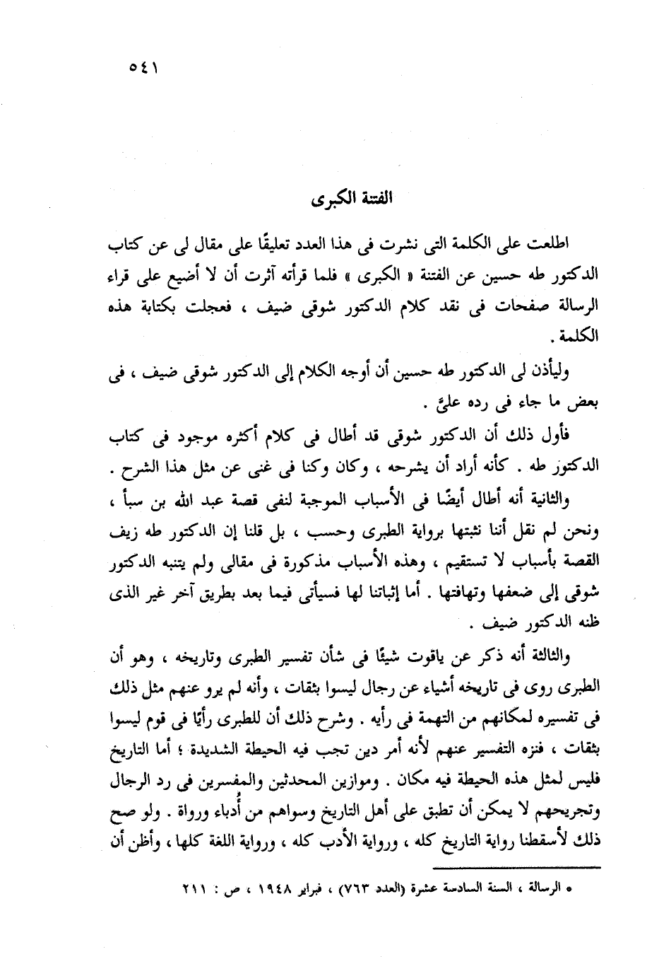 اطلعت على الكلمة التي نشرت في هذا العدد تعليقًا على مقال لي عن كتاب الدكتور طه حسين عن الفتنة "الكبرى" فلما قرأته آثرت أن لا أضيع على قراء الرسالة صفحات في نقد كلام الدكتور شوقى ضيف، فعجلت بكتابة هذه الكلمة.