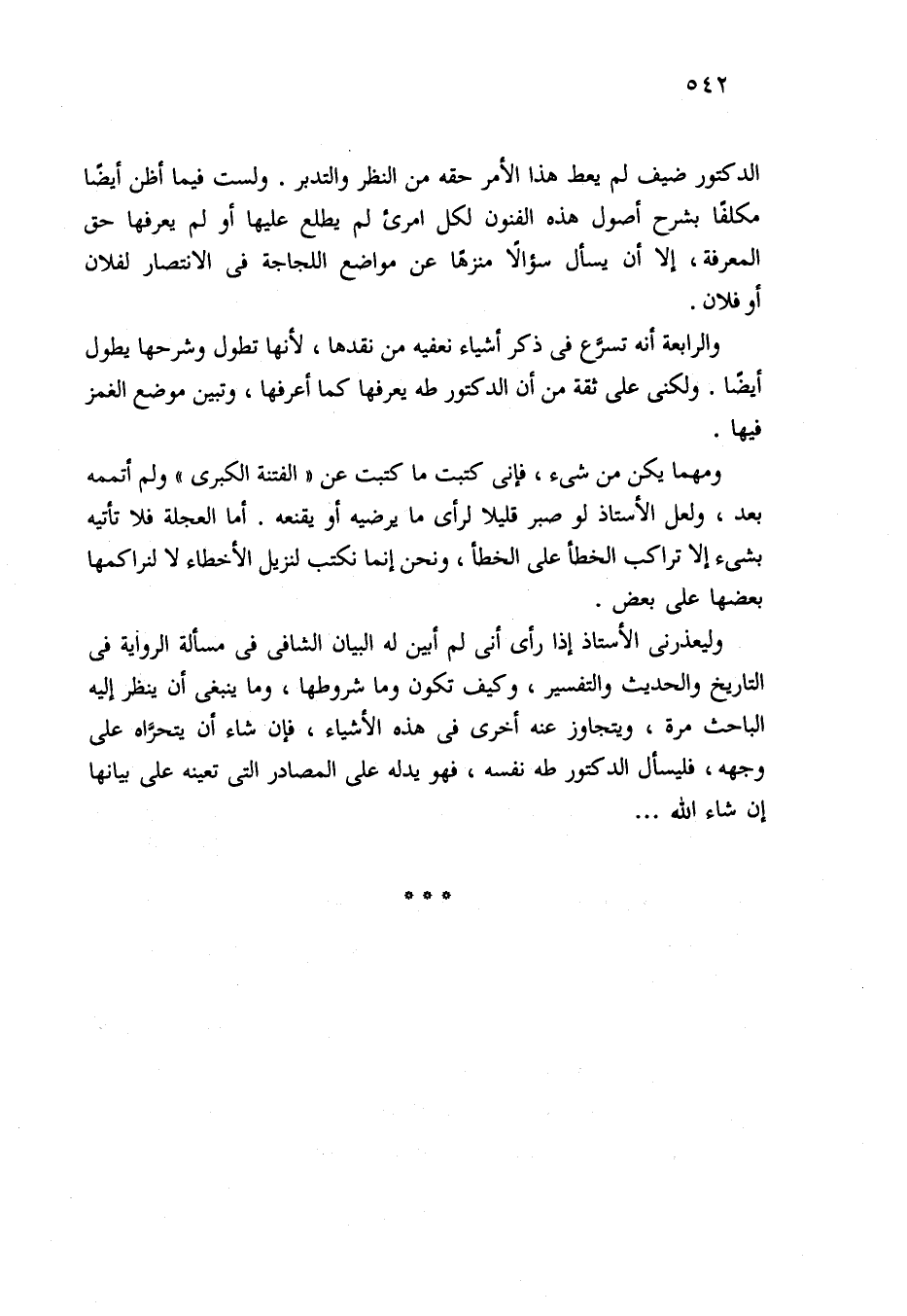 وليعذرني الأستاذ إذا رأى أني لم أبين له البيان الشافي في مسألة الرواية في التاريخ والحديث والتفسير، وكيف تكون وما شروطها، وما ينبغي أن ينظر إليه الباحث مرة، ويتجاوز عنه أخرى في هذه الأشياء، فإن شاء أن يتحرَّاه على وجهه، فليسأل الدكتور طه نفسه، فهو يدله على المصادر التي تعينه على بيانها إن شاء الله. . .