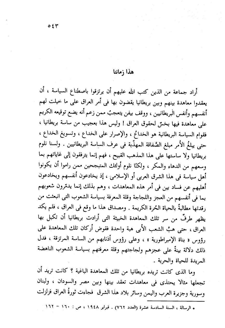 أراد جماعة من الذين كتب الله عليهم أن يرتزقوا باصطناع السياسة، أن يعقدوا معاهدة بينهم وبين بريطانيا يقضون بها في أمر العراق على ما خيلت لهم أنفسهم وأنفس البريطانيين، ووقف بيفن يتعجبُ ممن زعم أنه يضع توقيعه الكريم على معاهدة فيها بخسٌ لحقوق العراق! وليس هذا بعجيب من ساسة بريطانيا، فقوام السياسة البريطانية هو الخداعُ، والإصرار على الخداع، وتسويغ الخداع، حتى يبلغُ الأمر مبلغ الصَّفاقة المهذّبة في عرف الساسة البريطانيين. ولسنا نلوم بريطانيا ولا ساستها على هذا المذهب القبيح، فهم إنما يترفقون إلى غاياتهم بما وسعهم من الدهاء والمكر، ولكنّا نلوم أولئك المتبجحين ممن راموا أن يكونوا أهل سياسة في هذا الشرق العربي أو الإسلامي، إذ يخادعون أنفسهم ويخادعون أهليهم عن فساد بين في أمر هذه المعاهدات، وهم بذلك إنما يدمّرون شعوبهم بما في أنفسهم من العجز واللجاجة وقلة المعرفة بسياسة الشعوب التي انبعثت من رقدتها مطالبةً بالحياة الحُرة الكريمة. ومصداق هذا ما وقع في العراق، فلم يكد يظهر طرفٌ من سر تلك المعاهدة الخبيثة التي أرادت بريطانيا أن تكبل بها العراق، حتى هبَّ الشعب الأبى هبة واحدة فقوض أركان تلك المعاهدة على رؤوس "بناة الإمبراطورية"، وعلى رؤوس أذنابهم من الساسة المرتزقة، فدل ذلك دلالة بينةً على عجزهم ولجاجتهم وقلة معرفتهم بسياسة الشعوب الناهضة المريدة للحياة والحرية.